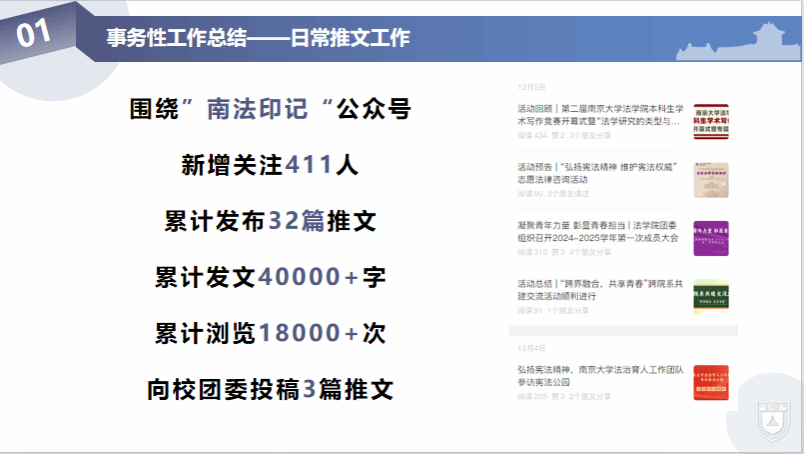 团委学术科创部在第七期工作坊中聚焦挑战杯等学科竞赛,明确项目目标与定位,优化项目对接与管理,通过建立工作大群提升沟通效率;同时,紧扣关键时间节点,组织专家指导和午餐会活动,助力项目申报书优化和质量提升。此外,学术科创部还积极推动学术论文写作竞赛的筹备工作,为法学研究提供学术交流平台。