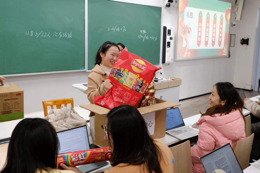 活动伊始,一场妙趣横生的成语接龙游戏活跃了现场的气氛,同学们热情高涨,积极参与。根据游戏结果,同学们抽取了“干货满满”“永葆童心”“甜甜蜜蜜”“牛气冲天”等主题的迎新盲盒大礼包。这一活动在给紧张复习中的同学们带来片刻轻松的同时,更进一步增强了班级的凝聚力。
