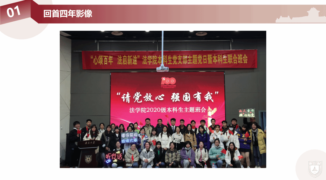 活动伊始,本科四年级团总支书记殷逸洲同学播放了由班委制作的2020级班集体纪念影像视频,带领大家回顾了四年本科生活的点点滴滴,将本次班会引入了毕业季的氛围中。