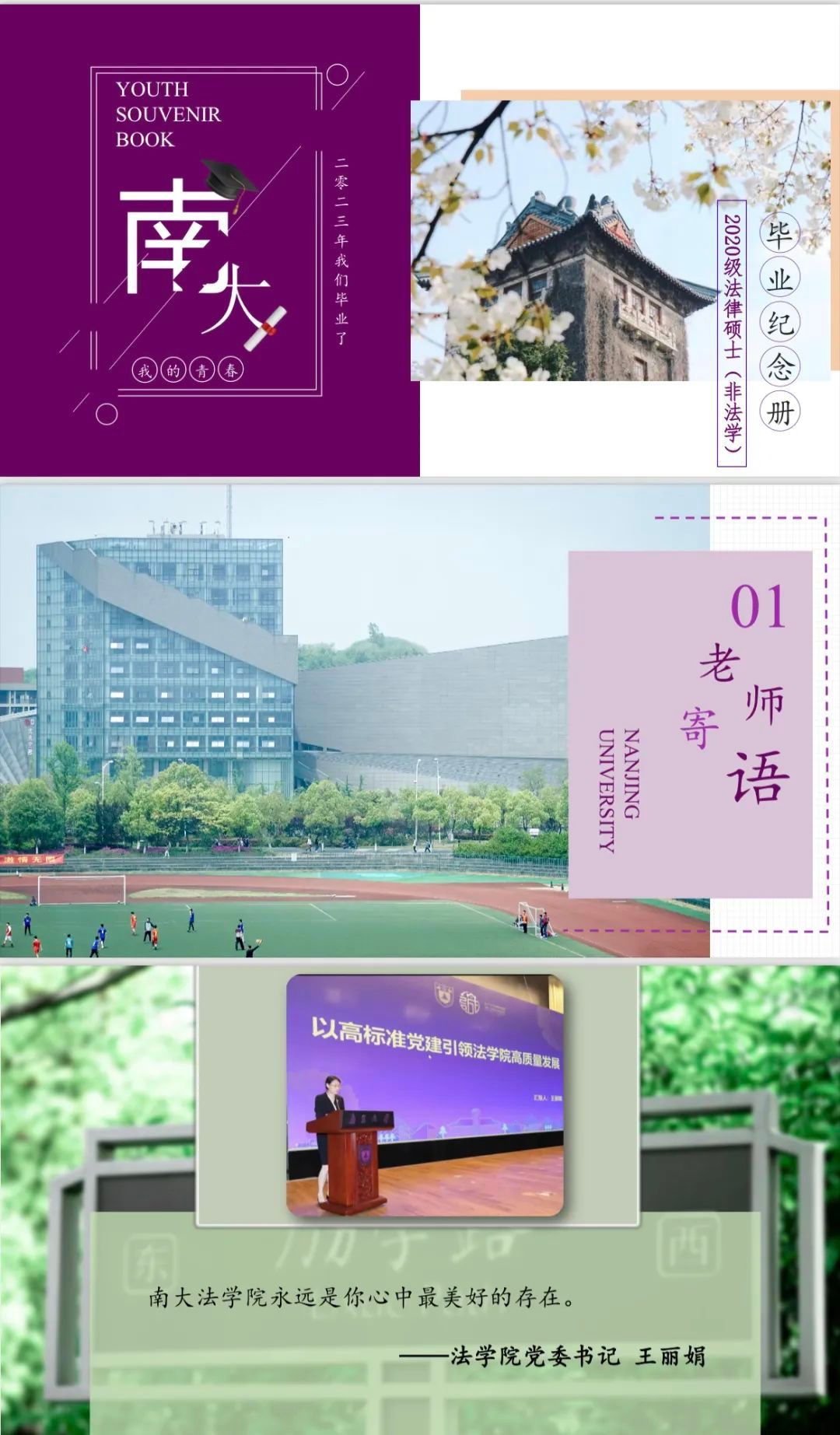 从初识南法,到今朝离别,曾迎着风雨前行,也沐浴阳光成长。将记忆融入北大楼前茂盛的草坪,将青春揉进逸夫馆内摊开的笔记,砥砺“奋进”之路上曾有南法你我的身影。毕业纪念册中的点点滴滴,勾起了同学们的回忆与共鸣;道不尽的滔滔师恩,激发了同学们坚定信念、接续奋进、回报母校的深厚情谊。