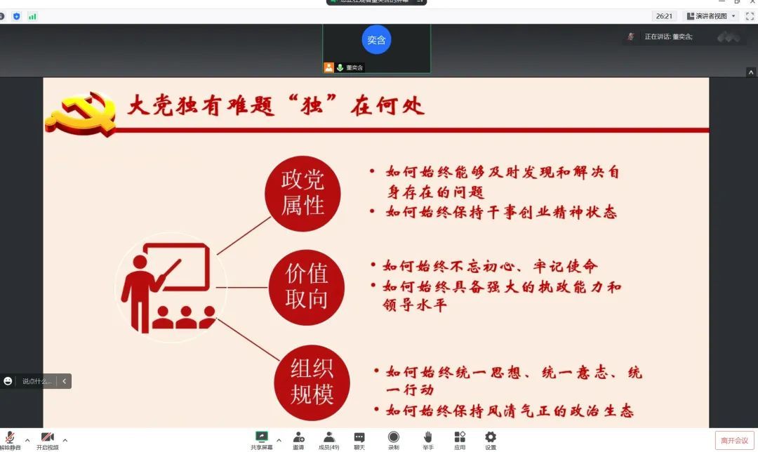 第三位分享的同学是吕梦迪同学,她以“答好六个‘如何始终’,破解大党独有难题”为题,分享了自己关于“党的建设”、“自我革命”的学习体会。2023年1月9日,习近平总书记在二十届中央纪委二次全会上发表重要讲话,指出要在新时代新征程上一刻不停推进全面从严治党。并用“六个如何始终”对大党独有难题作出深刻阐释,充分体现了我们党对于自身性质、形势任务、党情变化的深刻认识,展现出强烈的忧患意识、清醒的政治自觉和坚定的战略自信。因此,我们要深刻领会习近平总书记讲话的重要内涵,时刻保持解决大党独有难题的清醒和坚定,以彻底的自我革命精神破解大党独有难题。