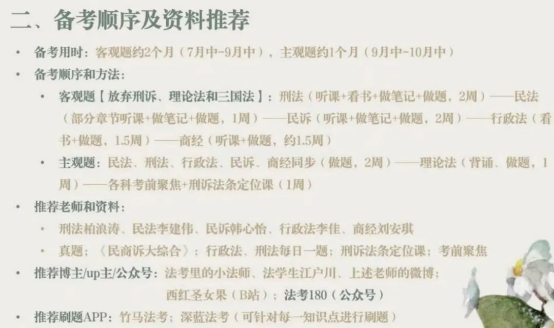 需根据学科性质与性价比、自身基础等来选择复习方法和侧重点。学姐本人客观题备考用时约2个月(7月中-9月中),主观题约1个月(9月中-10月中),可供同学参考。
