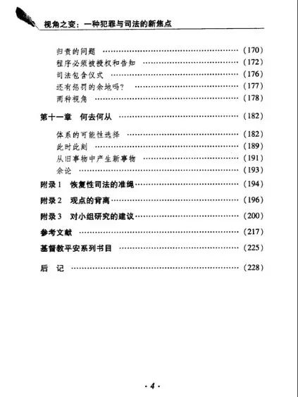 《视角之变:一种犯罪与司法的新焦点》考察了我们对犯罪和司法的假设,将之命名为“报应性”视角或范式。然后又考察了历史的、圣经的和实践的三大不同视角。《视角之变:一种犯罪与司法的新焦点》提出了一种“恢复性”模式——这一模式更加切合实践经验、历史做法和圣经传统。这一模式植根于被害人和犯罪人的需要,同样也植根于过去应对犯罪的方式、当前的经验,以及圣经的原则。