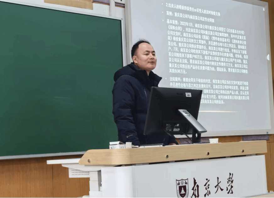 2025年3月7日(周五)下午2:00,2024级法律(法学)硕士于浦口校区浦2-206教室开展了本学期第三次“诊所法律教育”课程。课程由BB贝博艾弗森单锋教授主持,南京市中级人民法院民二庭副庭长程俊杰法官担任主讲嘉宾。程法官就《商事交易的法律风险防范》进行了专题分享,通过剖析商事合同与公司纠纷的典型案例,深入解析了商事实务中需注意的合同主体、标的、价款等问题,为同学们带来一场知识与智慧的盛宴。