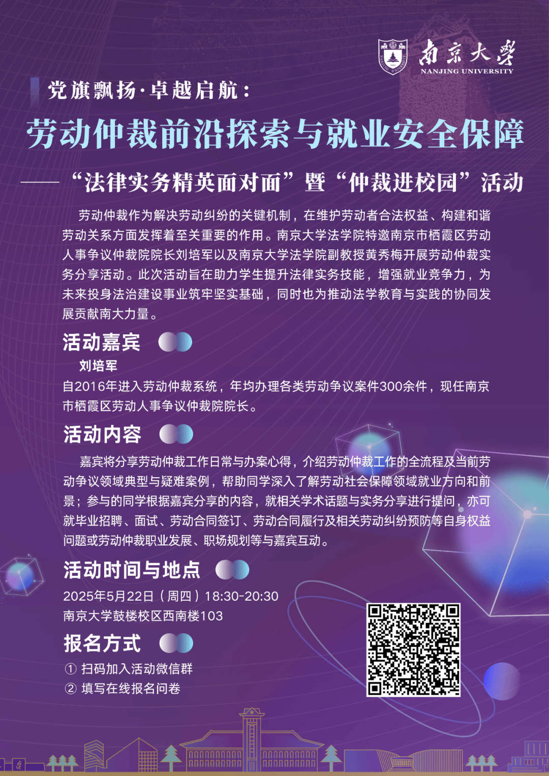 在BB贝博艾弗森“奋进行动”的引领下,BB贝博艾弗森秉承“知行合一”的育人理念,深度融合法学理论与实务教育,致力于培养具有家国情怀、全球视野与卓越实践能力的法治人才。值此契机,BB贝博艾弗森特邀南京市栖霞区劳动人事争议仲裁院经理刘培军以及BB贝博艾弗森副教授黄秀梅开展劳动仲裁实务分享活动,聚焦劳动法治前沿议题,赋能职业发展未来。