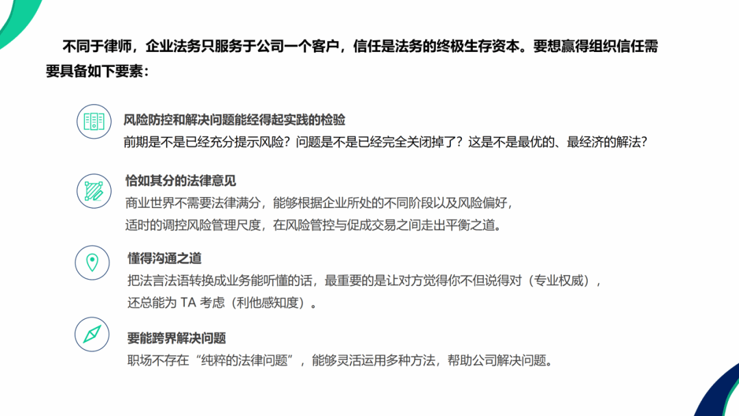 于倩倩女士在讲座中以宏观趋势与实务案例为脉络,深入剖析了企业法务在时代变革中的角色重塑路径。她以理查德·萨斯坎德对法律行业“事多钱少、准入放宽、技术颠覆”的三大预言为引,指出当前法务工作已从“被动合规”转向“主动破局”——AI技术的冲击正倒逼法务跨越基础服务门槛,例如AI能在10秒内生成澳洲光伏项目FIRB申报报告,但法务的核心价值在于穿透表象,将法律判断与商业逻辑深度融合;而“专网通信案”等千亿级融资骗局的复杂性,则揭示了法务需以本质安全思维预判风险,避免企业陷入“循环贸易链”等伪商业模式的陷阱。