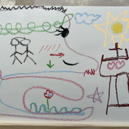 为了更好的促进大家的交流与互动,主持人邀请大家参加“一人一笔”——共同创作绘画。在大家的积极参与下,每个人都发挥了想象力和创造力,在空白的画板上留下可爱的涂鸦。美丽的画作不能缺少每位同学的参与,正如生活中的每个人都是独一无二、不可或缺!