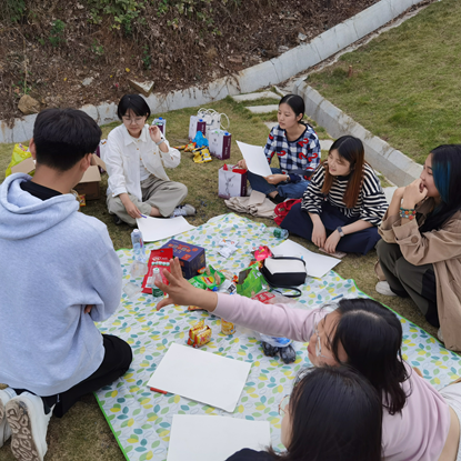 更喜欢智斗的同学们选择了参与“谁是卧底”小游戏。大家在野餐布前围坐成一圈,进行着一场看不见硝烟的“战争”。