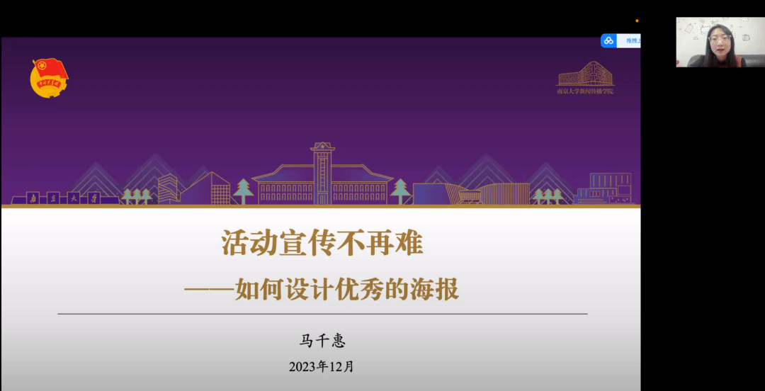 部分大型活动的开展,一般需要历经前期预告、中期推进和后期回顾三个过程,每一阶段都需要一张张引人驻足的海报作为点睛之笔和加持动能。马千惠讲师具有丰厚的海报设计和推送经验,在本次授课中,她从设计风格、字体选择、排版技巧、素材积累四方面,与同学们分享了海报设计的经验技巧。