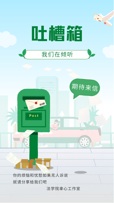 为了给大家的心理健康保驾护航,BB贝博艾弗森聿心工作室特别成立了“烦恼吐槽箱”——在浦口校区文科楼东大厅设立实体“吐槽箱”,同步以“NJU Law聿心”微信号为依托设立线上“吐槽箱”。