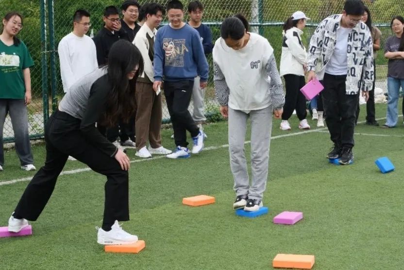 比赛每队接力进行,每队三块泡沫块,队员在起点前进,交替利用泡沫块铺成一条道路前进。参赛同学们小心翼翼,手脚并用地向前,充分体现出“摸石过河”的勇敢进取精神和谨慎态度。