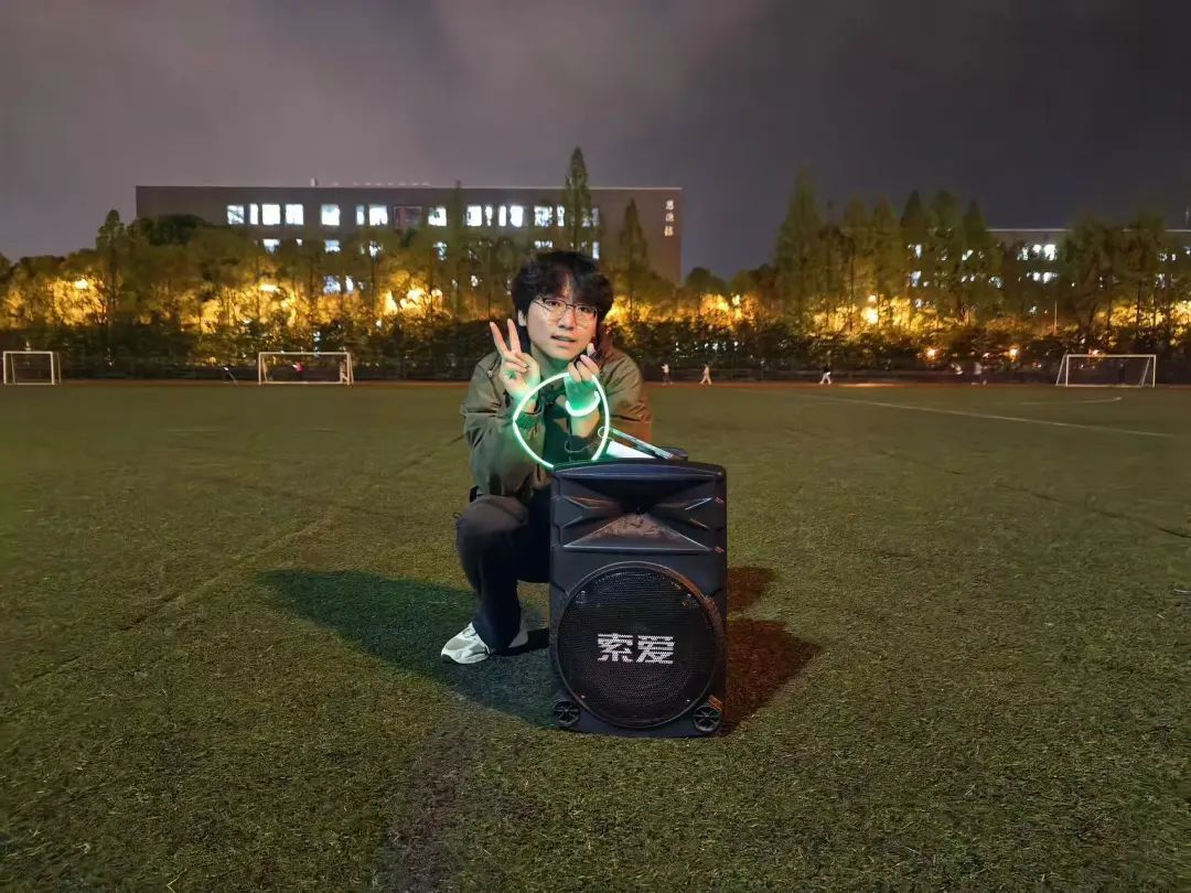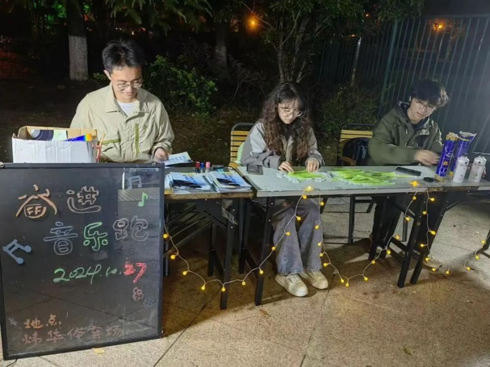 在操场的一隅,一群志愿者们正围绕着音响设备忙碌着。他们的手中传递着线材和工具,脸上洋溢着专注而满足的笑容。悠扬的旋律在校园中回荡,夜色也不再孤单。