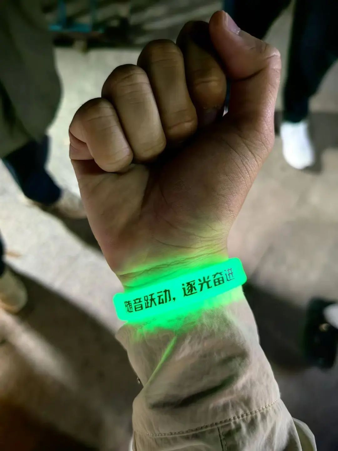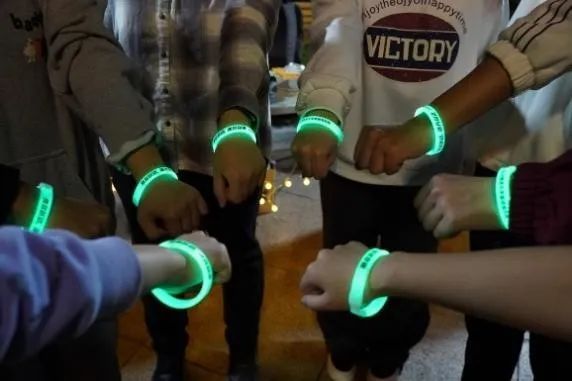运动场上,手环荧光闪烁,与夜晚的星空交相辉映,点亮了一张张青春的脸庞上活泼的笑颜。