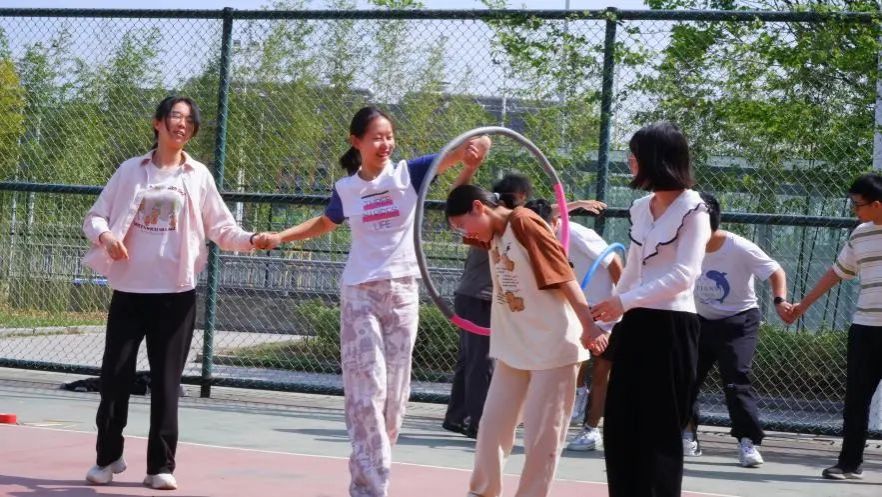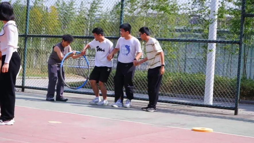 参赛同学们需在不松开手的情况下,让呼啦圈顺利穿越每个人的身体,最终回到原位。随着裁判一声令下,第一位同学膝盖微屈、重心下沉,带动呼啦圈轻盈地跃过头顶,相邻的同学同步则微倾身体,让呼啦圈得以顺利传递。其不仅考验着个人肢体的灵活性和协调性,也需要团队之间的默契与协作。