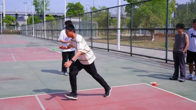 在这个项目中,队员需要接力将起点的球用筷子迅速夹到终点的盆中,若不慎掉落则回到起点重新开始。只见参赛成员们压低重心、屏息凝神,脚步细碎而又快速前行,稳稳当当地将小球夹到终点的盆中。这个活动充分展现出同学们的耐心和细心。