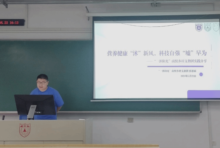 接下来,贾思涵同学为以“营养健康‘沭’新风,科技自强‘墟’早为”为题,向同学们分享了他在江苏省宿迁市沭阳县高墟镇高墟中心小学的支教和实践经历,并用视频的方式讲述了他与支教伙伴及当地小朋友们相处的温馨瞬间。贾思涵同学着重强调了开展有内涵、有深度的项目调研的重要性,并指出“一次出色的社会实践可以持续发展下去”。他提到,深入参与一次社会实践,未来还可以衍生出更多的发展机会,比如申报挑战杯、老员工创新创业竞赛项目、参与基础学科论坛,或是加入志愿服务方面的高规格赛事。