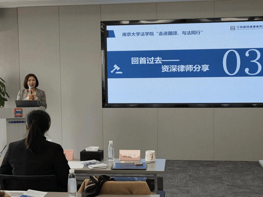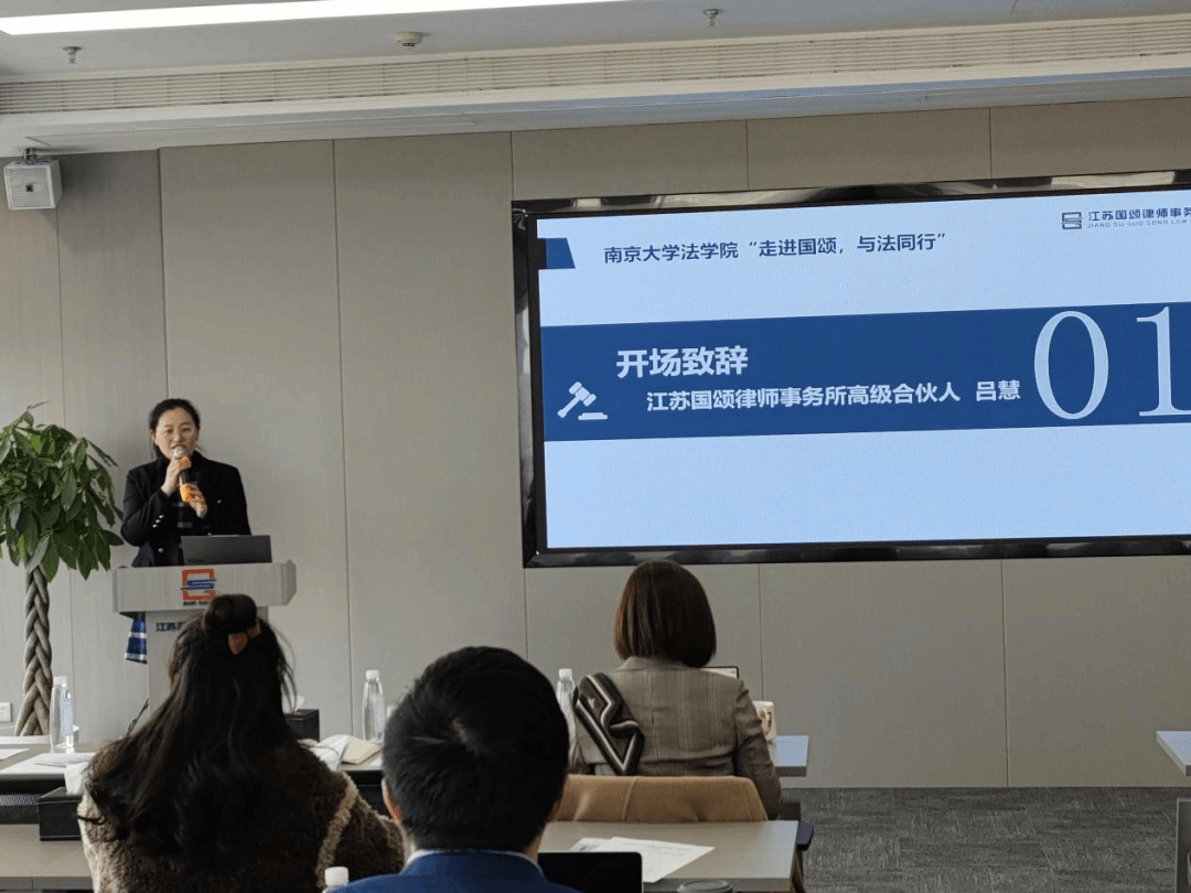 江苏国颂律师事务所高级合伙人吕慧代表律所对同学们的到来表示热烈欢迎,她对律所进行了简要介绍:国颂弘扬奋进、友善、愉悦的律所文化,同时积极打造专业、高效和诚信的法律服务机构,为客户提供全方位、高质量、高赋能的法律服务,兼具重大商事争议业务中心、刑事业务中心、公司业务部、投资业务部、政府法律顾问业务部等多业务模块。吕律师希望各位同学有所收获,并相信国颂能为南大法员工社会实践活动提供有力的支撑,也期待本次活动可以成为律所与BB贝博艾弗森深入交流与合作的起点。