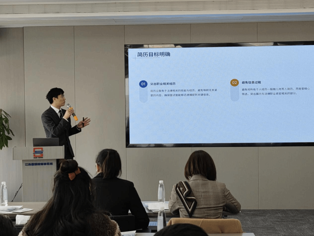 江苏国颂律师事务所刘昊天律师,以青年律师的身份,分享自己从员工到执业律师的成长经验与感悟,为大家提供宝贵的建议。刘律师以“走出象牙塔,法律学子的执业启程”为主题,指导法律学子如何从校园走向职场,顺利完成职业转型。他从简历制作、面试技巧、着装建议以及提升应聘竞争力等多个方面,为南大学子提供了细致的分享。