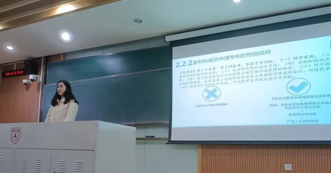 随后,为了使现工院的同学们更加进一步了解材料领域的知识产权保护,志愿者为同学们介绍了专利权的五大特点,让同学们对专利权有了直观的认识。接下来,志愿者针对性地讲解了材料领域能够申请专利权的情形,包括制造材料的设备、材料本身、制备方法等等,为同学们在未来的发明创造中保护自身知识产权提供了指引。