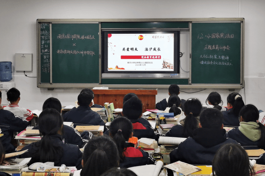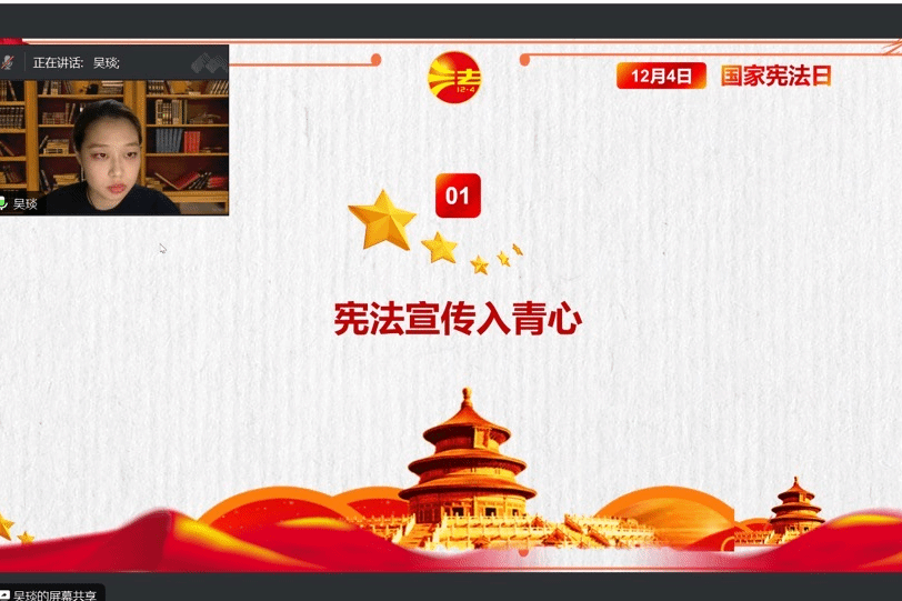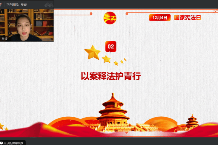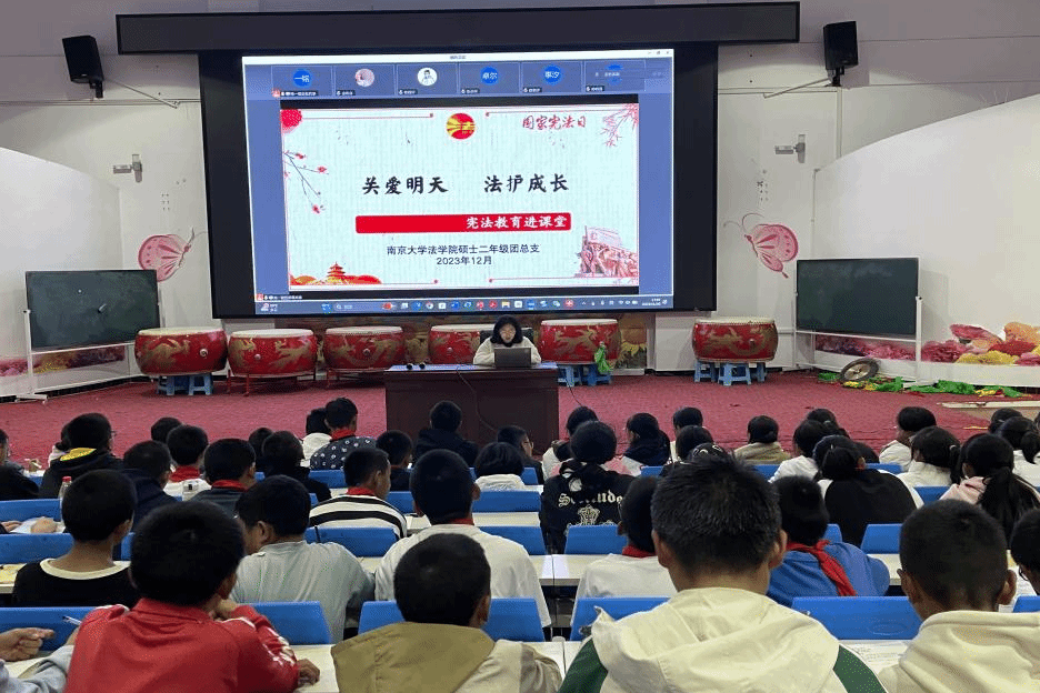 2023年12月4日是第十个“国家宪法日”,为深入学习贯彻习近平法治思想,大力弘扬宪法精神,树立宪法权威,加强法治教育,2022级硕士团总支对接云南双柏县第一中学、湖北巴东官渡口镇初级中学、云南双柏县妥甸中学、宁夏隆德县第二中学、宁夏泾源高级中学、贵州红湖中学在“宪法宣传周”期间,开展“关爱明天·法护成长”公益普法系列宣讲活动。2022级硕士团总支副书记陈一铭主持系列宣讲活动。