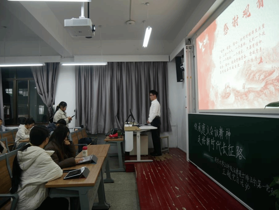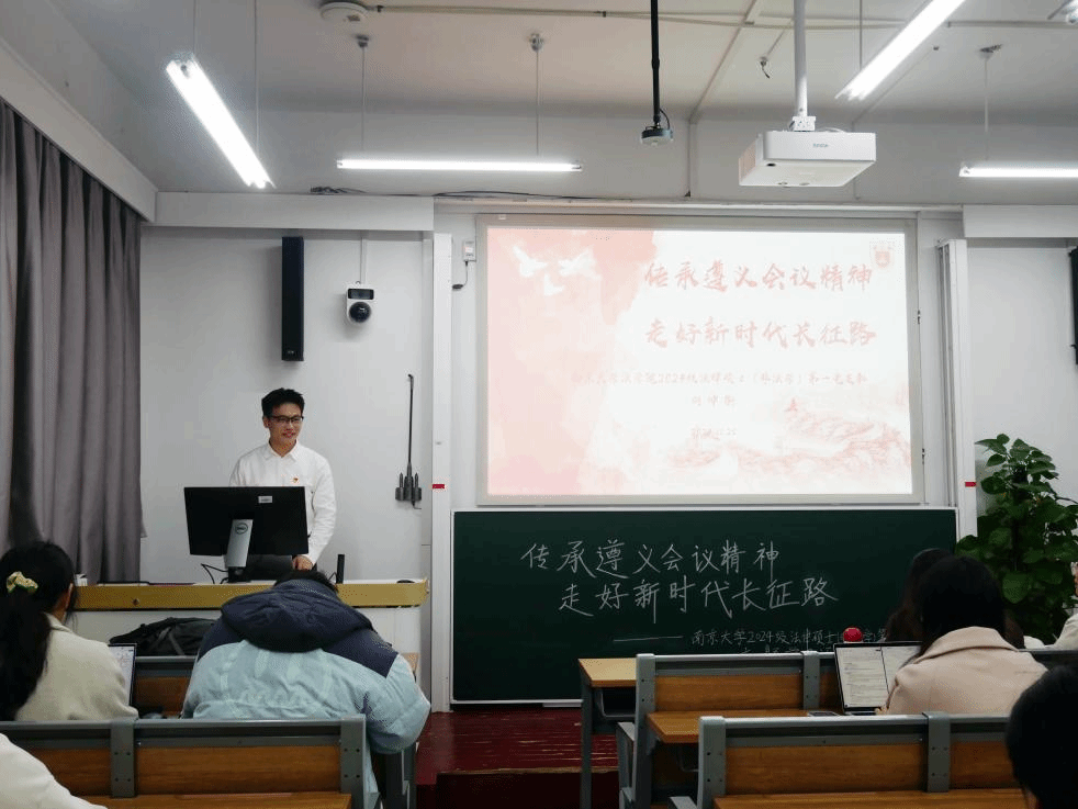 11月28日,“义路黔行”志愿宣讲团受邀向2024级法律硕士(非法本)第一党支部的同学们开展活动。宣讲团成员何坤衡以“传承遵义会议精神,走好新时代长征路”为主题进行宣讲。