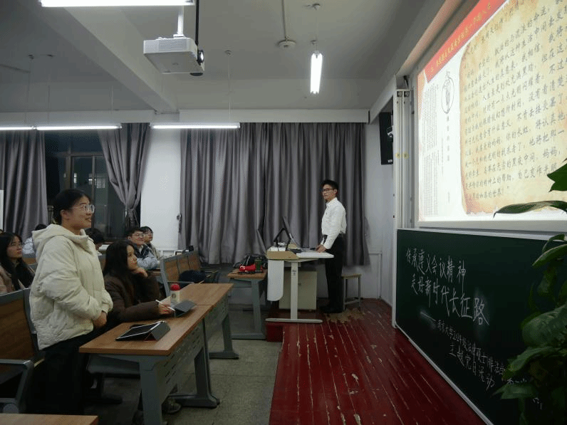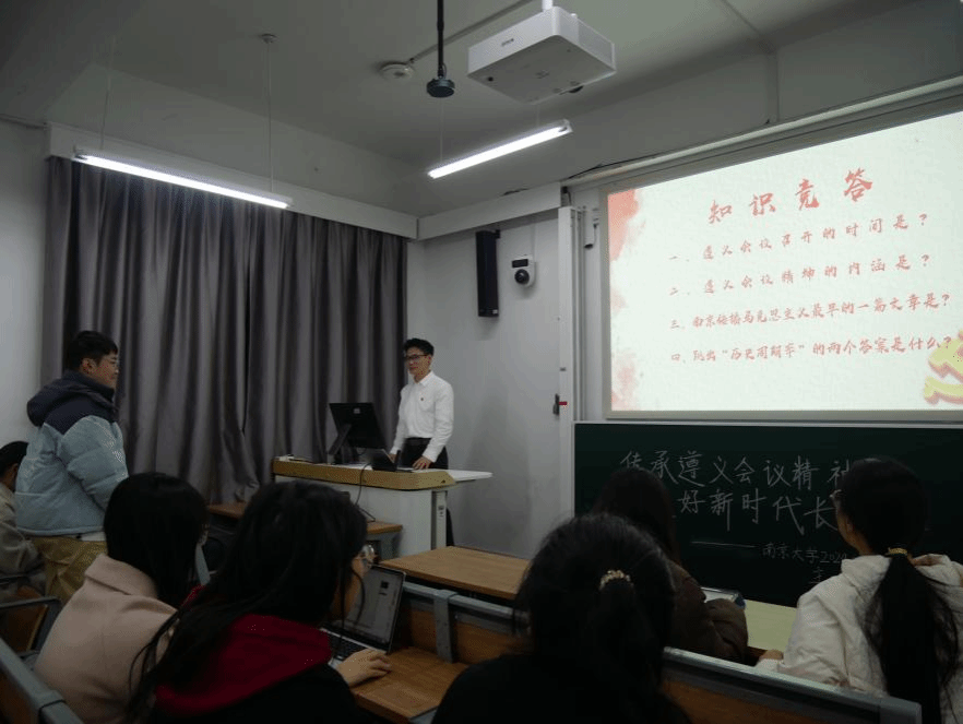 在理论学习之后,主讲人又设计了诗文朗诵、知识问答等环节,将活动的氛围推向了高潮。同学们通过朗诵张闻天同志在入党时所创作的《飘零的黄叶》,表达了对革命先辈们的崇高敬意与深切缅怀。知识问答则有效地检验了同学们在前期学习过程中的知识掌握程度,同时也进一步加深了大家对遵义会议精神的理解与认识。