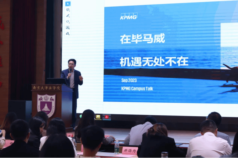 毕马威会计师事务所审计部高级经理刘钢以自身经历为切入点,强调法律与多种专业融合在实践中的应用。之后,他从事务所收入状况、员工人数、业务行业等方面介绍了毕马威的概况,其主要服务有审计及鉴证、税务、咨询等。随后,他分享了该公司的职业发展路径,通过12年周期的“助理—助理经理—经理—高级经理”生涯规划,关注员工专业服务能力的提高,从而使其在团队合作中获得发展。最后,他介绍了毕马威中国的招聘职位、招聘对象与攀登者计划,并欢迎同学投递简历。