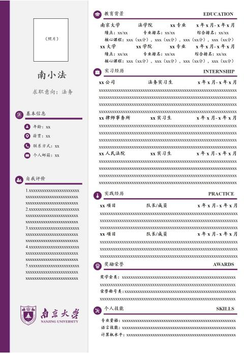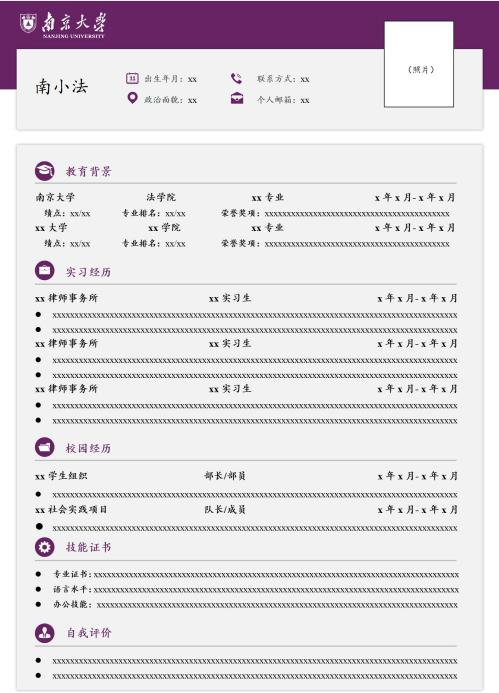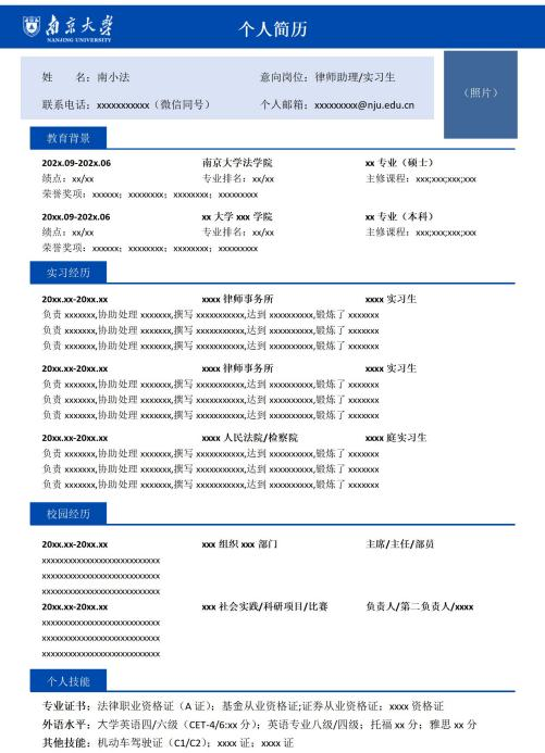 相比于政务类、升学类简历,律所类简历更应当突出与实务相关的实习经历;社会实践、科研经历、员工工作等内容若与所申请的执业方向高度相关,可适当详细说明,否则略写即可。