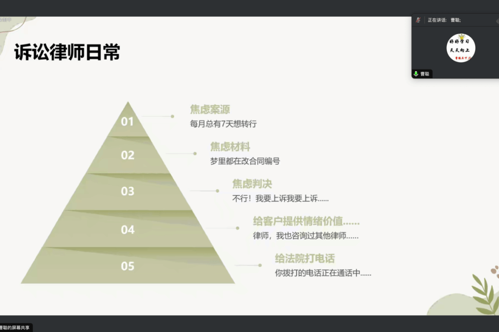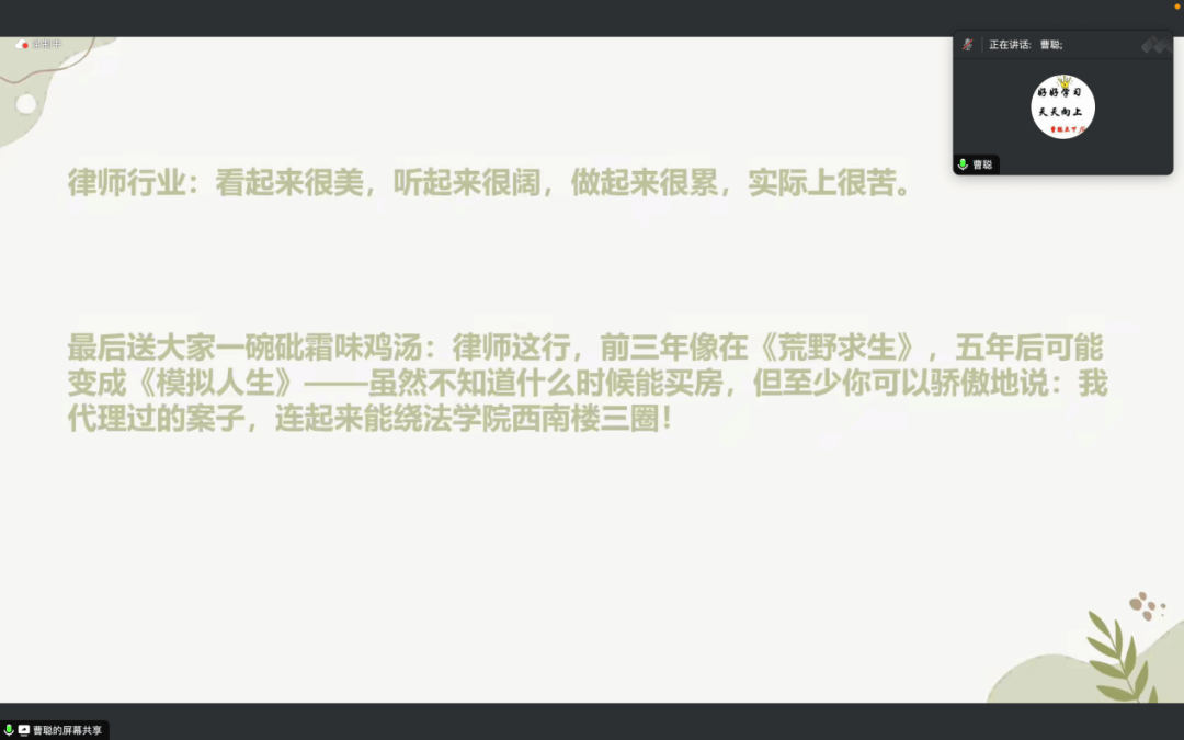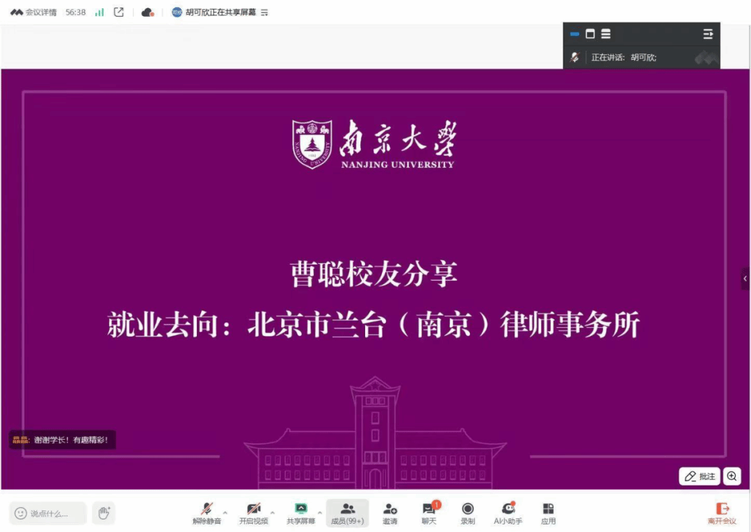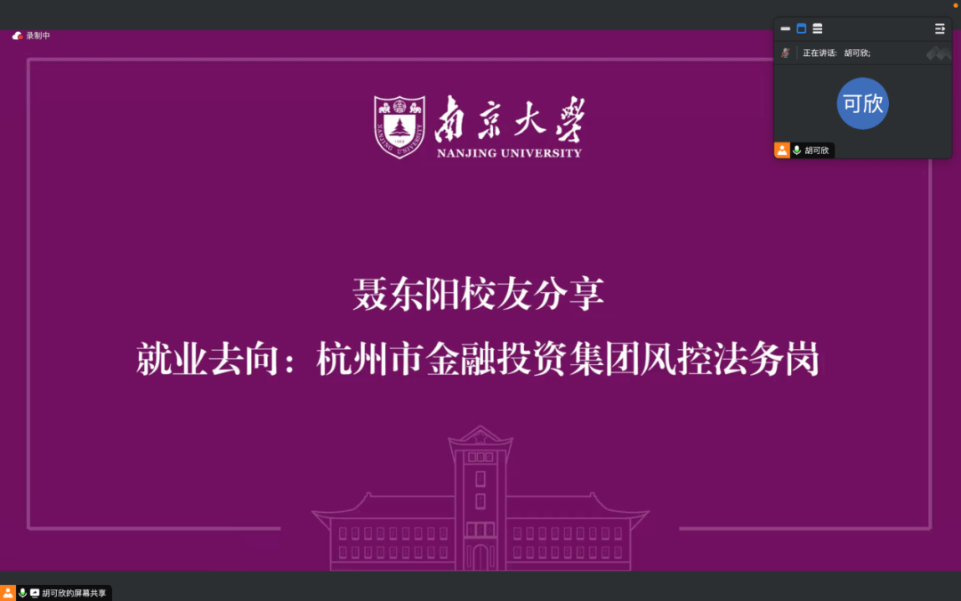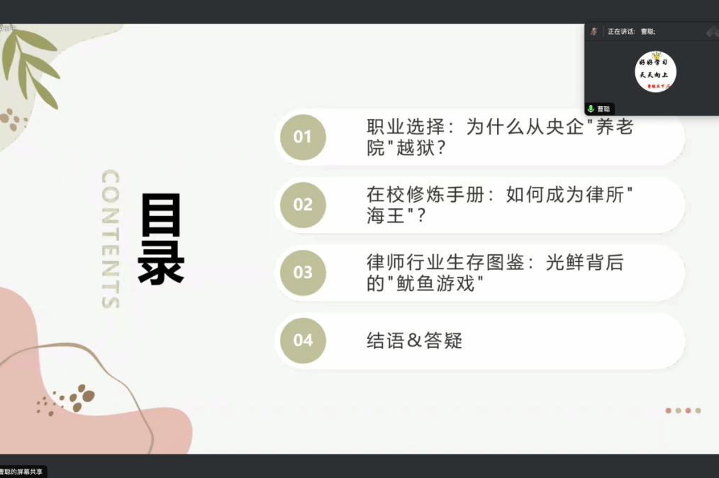 曹聪学长的分享从“职业选择”“在校修炼手册”“律师行业生存图鉴”三个方面展开。他首先从律所和法务工作的不同特点出发,分享了自己从央企法务向律师工作转向的原因。随后基于自身经验为在校同学提出了建议:读研期间可以以实习和成绩两方面作为抓手,一方面要通过关注公司实习群、联系员工等方式多主动争取实习机会,以提升自己的专业素养;另一方面也要注重课程学习,尤其是认真对待同今后执业方向可能相关的专业课程。