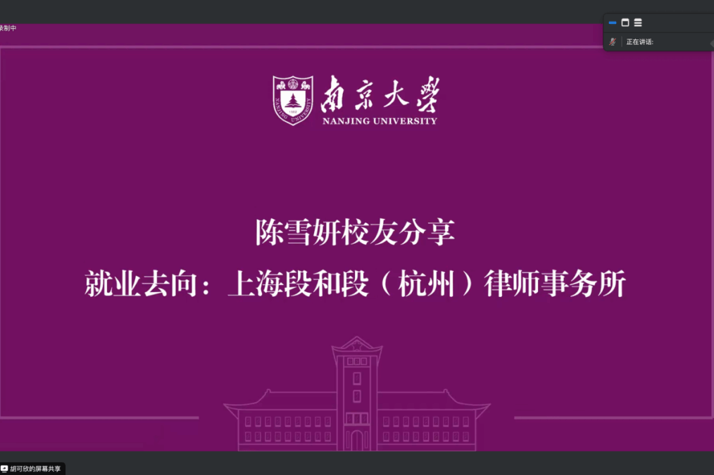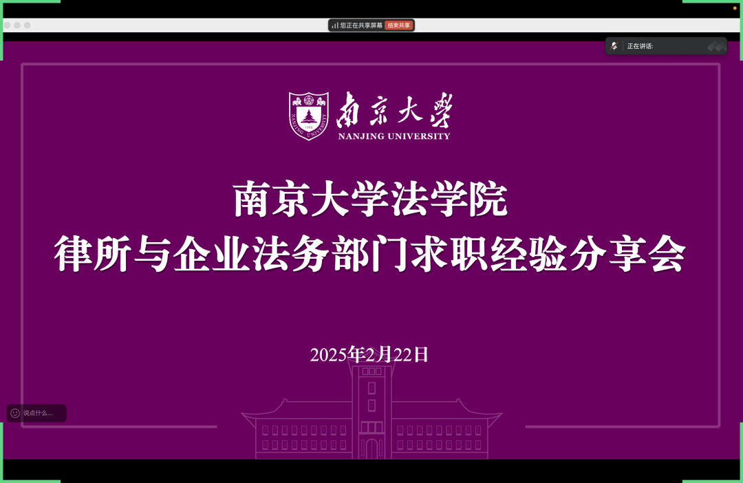 陈雪妍学姐首先从个人基本情况及选择律师行业的原因出发,分享了自己校招选择江苏移动人力资源部门、此后又转回律师行业的择业心路历程。随后,学姐以周洛华老师的《时间游戏》为引,以“人上人游戏”和“天外天游戏”比喻两种不同职业选择方向,建议同学们在职业选择时充分了解自己的性格和优劣势,结合自身家庭情况,并咨询行业前辈,充分了解、评估风险后再作决策。