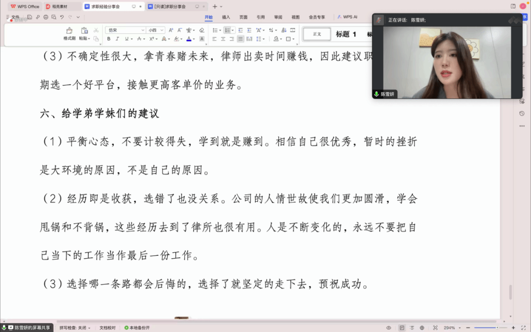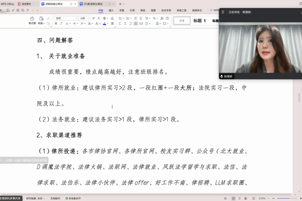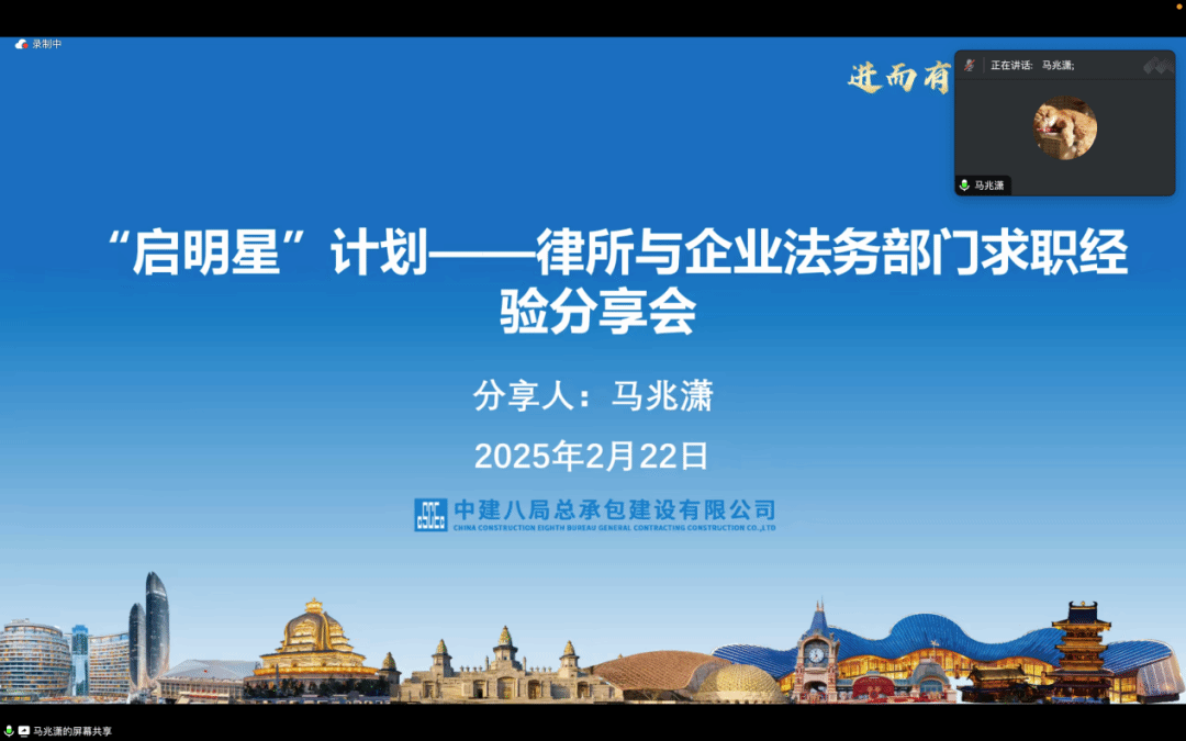 2025年2月22日晚19点,BB贝博艾弗森“启明星”计划——律所与企业法务部门求职经验分享会顺利举办。本次活动有幸邀请到陈雪妍、曹聪、聂东阳、马兆潇四位就职于律所和企业法务部门的员工进行经验分享,旨在帮助BB贝博艾弗森同学们更好地了解法律行业求职动态,掌握实用求职技巧,合理规划职业发展路径。