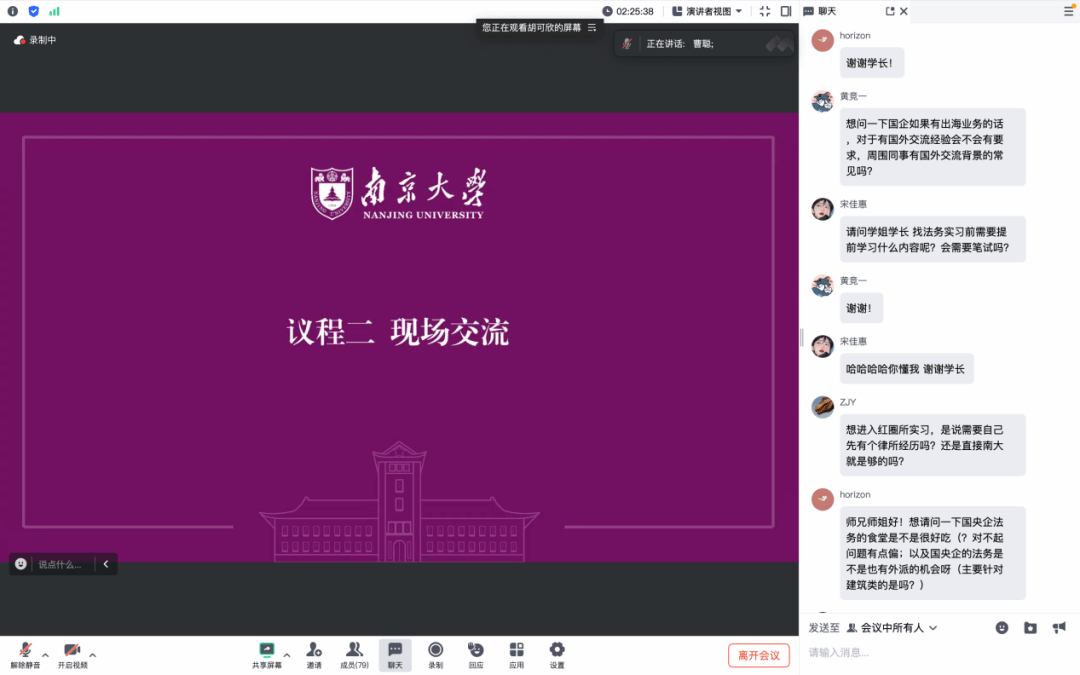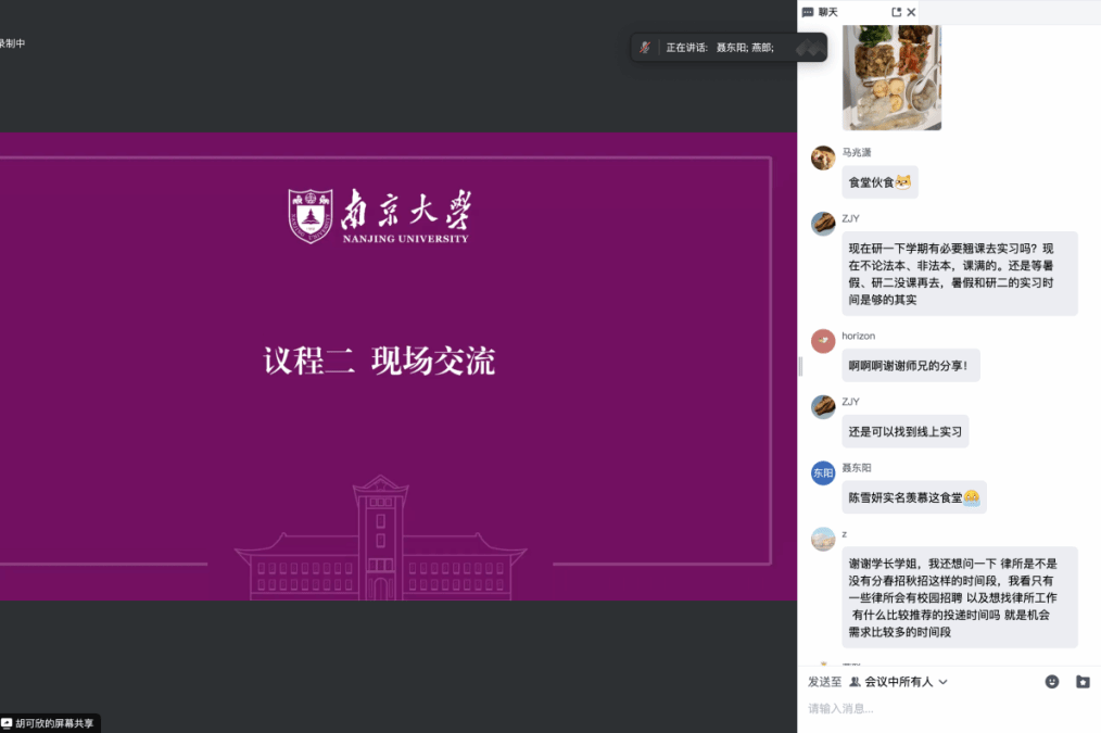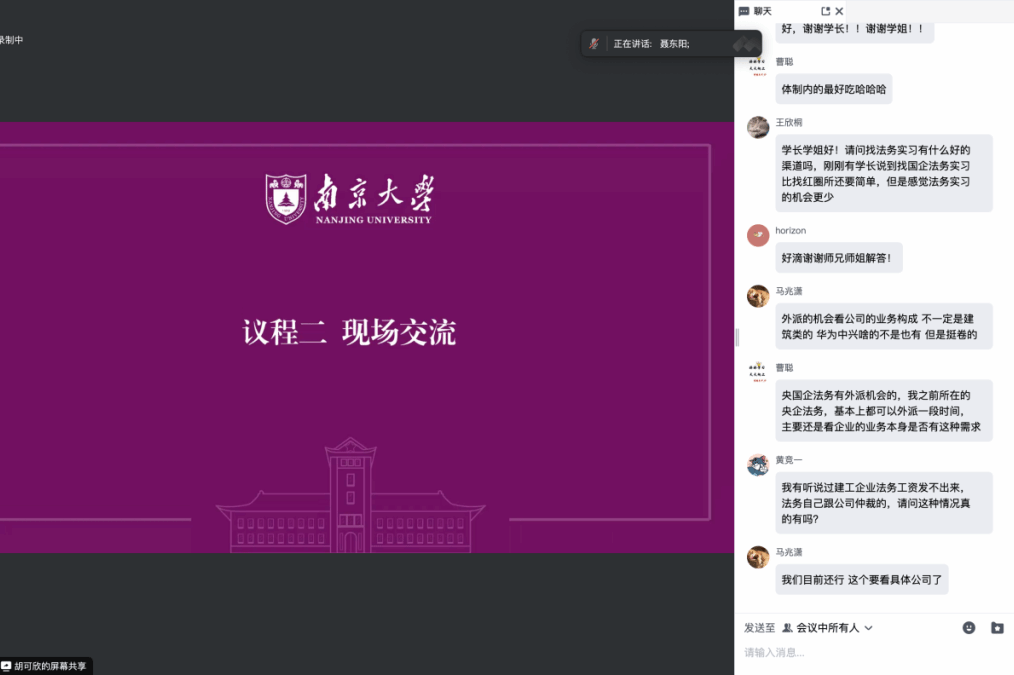 活动的最后,同学们就四位嘉宾分享的内容,结合自身学习求职过程中的困惑,围绕如何平衡毕业实习和秋招、国企出海业务的要求、法务实习和红圈所实习投递技巧等问题向嘉宾们进行了提问。学长学姐们也根据各自的经验进行了详细的解答。现场气氛热烈,评论区留言不断,嘉宾与同学们进行了深入而真诚的交流。通过交流互动环节,同学们掌握了更多求职技巧,也更加明确了自己的职业规划方向。
