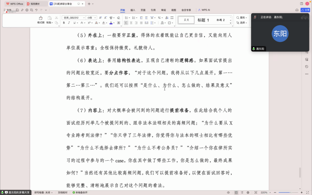 聂东阳学长首先和大家分享了自己的在校经历,随后详细讲述了个人的秋招选岗思路和秋招面试流程。他提到,以国企法务作为职业方向的优势在于:第一,可以实现工作生活平衡;第二,薪酬福利较有竞争力;第三,可以积累相关的行业经验,且在完成经验和资源积累后,倘若考虑从法务岗转向律师工作,此时阵痛期较短,而且在甲方服务的工作经验和看待问题的视角,也将对职业转型有所助益。