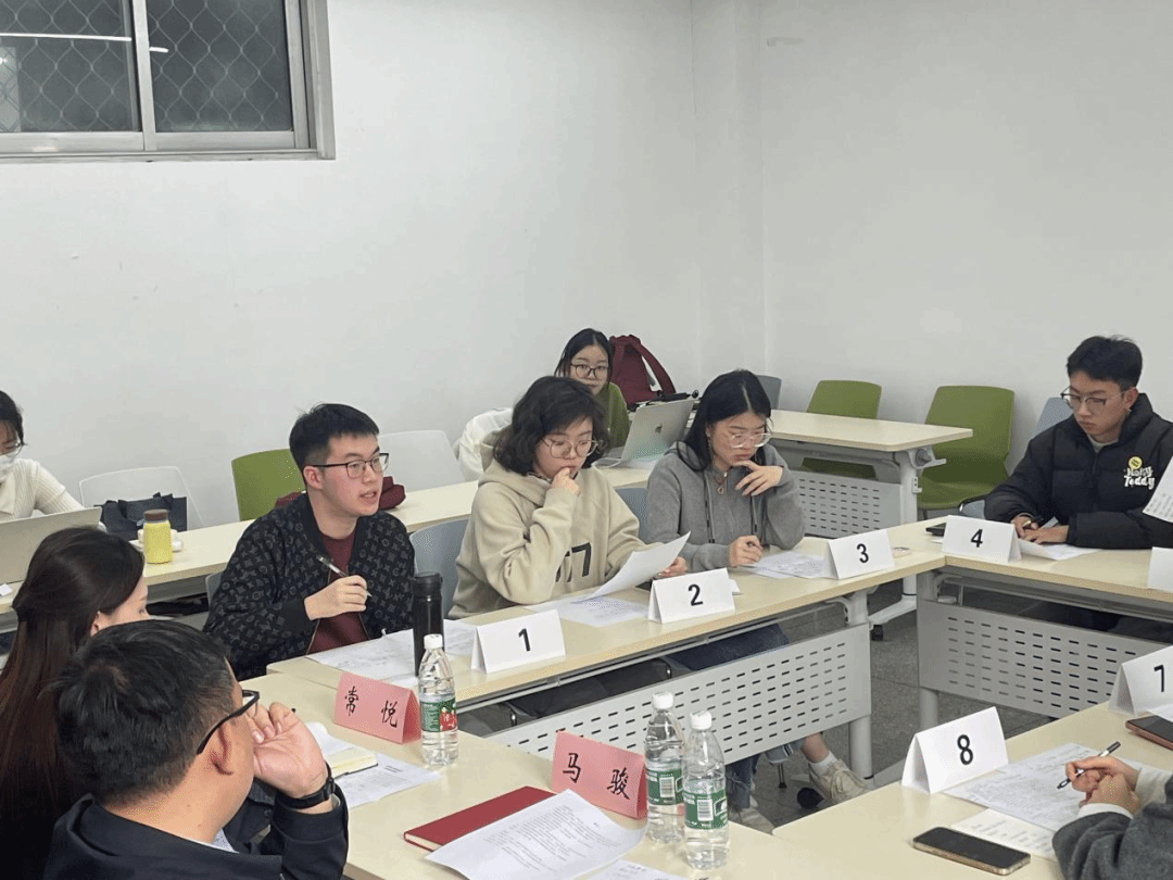 当讨论在上述三位同学的主导下进行得如火如荼之时,8号同学巧妙地通过提醒把控时间的提示性语言,切入自己的观点,主张在选择方案时应该尽可能兼顾到各方利益,从而也不动声色地把控起了讨论节奏。在之后的讨论中,八位同学分别围绕新业态人员的特点与困境、规制的介入时间、方案的可行性等展开了充分的论证,在给出选择理由的同时,也加强论述了各自的观点。经过充分的协作讨论和交流,八位同学对1、2、7三个方案达成了共识,并最终推举1号同学作为代表汇报小组结论和主要观点。至此,模拟面试环节正式结束。