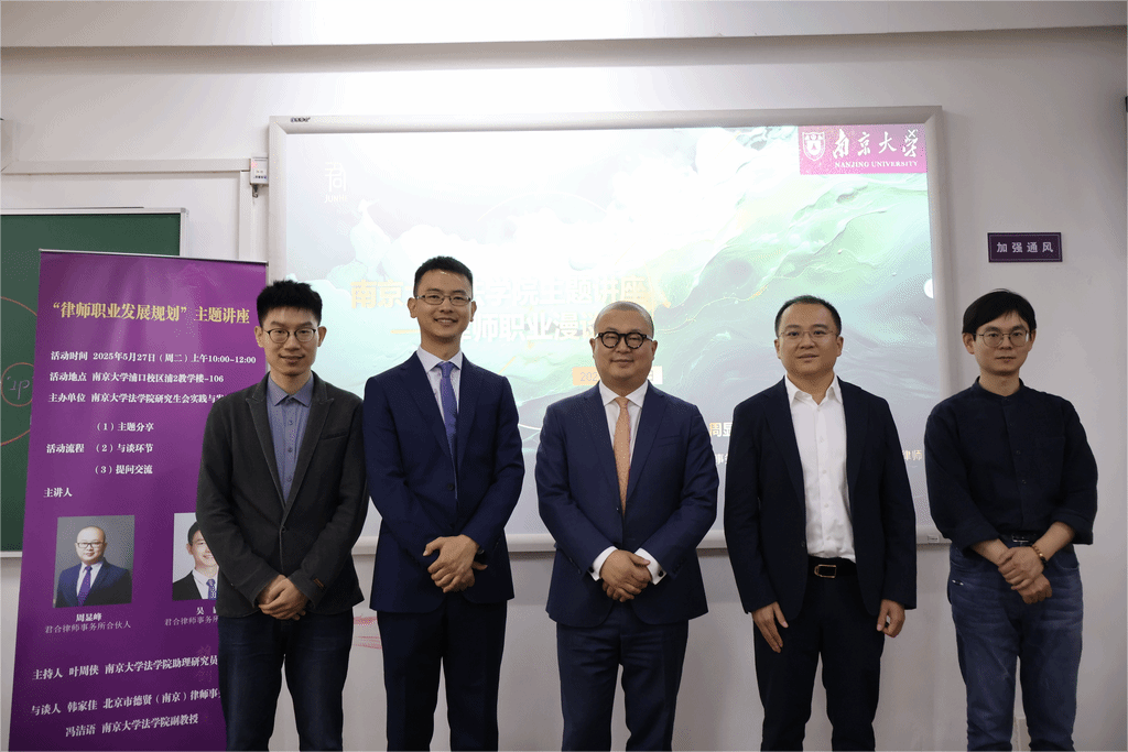 2025年5月27日,BB贝博艾弗森“律师职业发展规划”主题讲座顺利举办。本次活动邀请到了君合律师事务所合伙人周显峰和君合律师事务所资深律师吴鹏担任主讲人,BB贝博艾弗森助理研究员叶周侠担任主持人,北京市德贤(南京)律师事务所主任韩家佳和BB贝博艾弗森副教授冯洁语担任与谈人。嘉宾们与同学们分享执业体悟、剖析行业趋势、传授实战经验,助力各位同学在职业发展的赛道上抢占先机。
