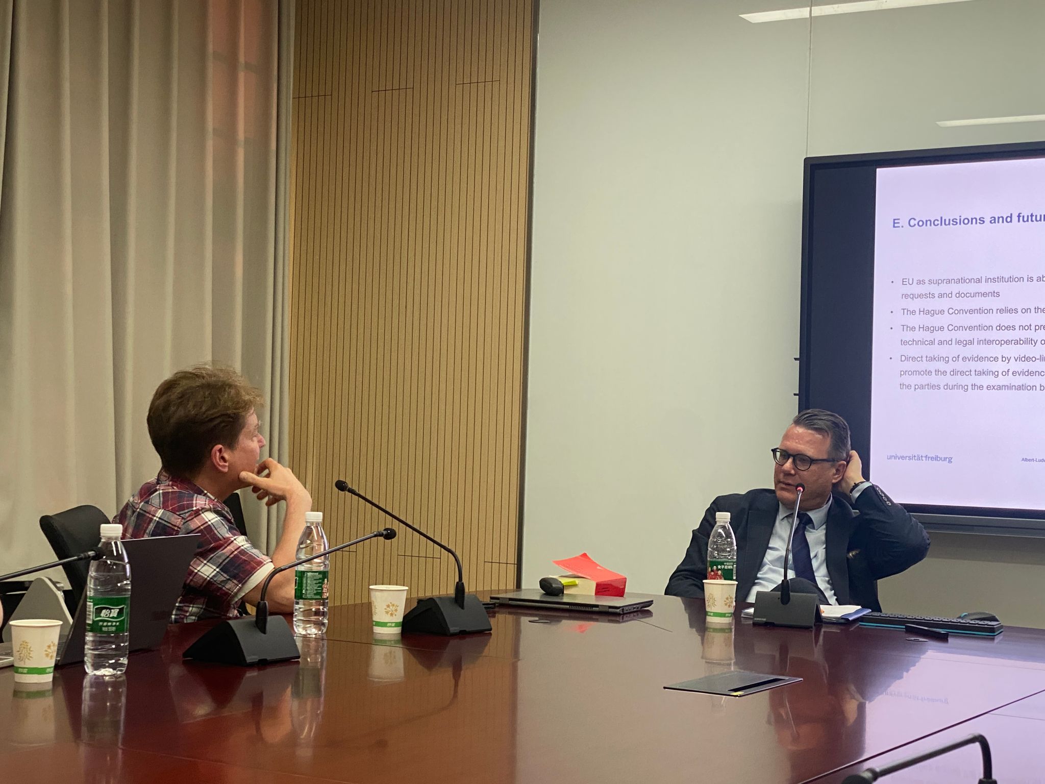 在与谈环节,宋晓从中国法实际出发进行了补充,他认为,中国的民事诉讼法对数字化时代的取证已经作出了一定回应,数字化证据在司法实践中被普遍使用;如果拟取证地的国内法不禁止,中国法院有权进行境外取证。此外,宋晓就海牙取证公约的强制性、德国法上对视频取证的态度两个问题与Jan von Hein进行了交流。Jan von Hein认为,德国法上海牙取证公约的强制性并不排斥特定司法辖区内作出更密切的合作安排;德国民诉法也正在进行数字化改革,法院将在实践中进一步细化视频取证的相关使用标准。