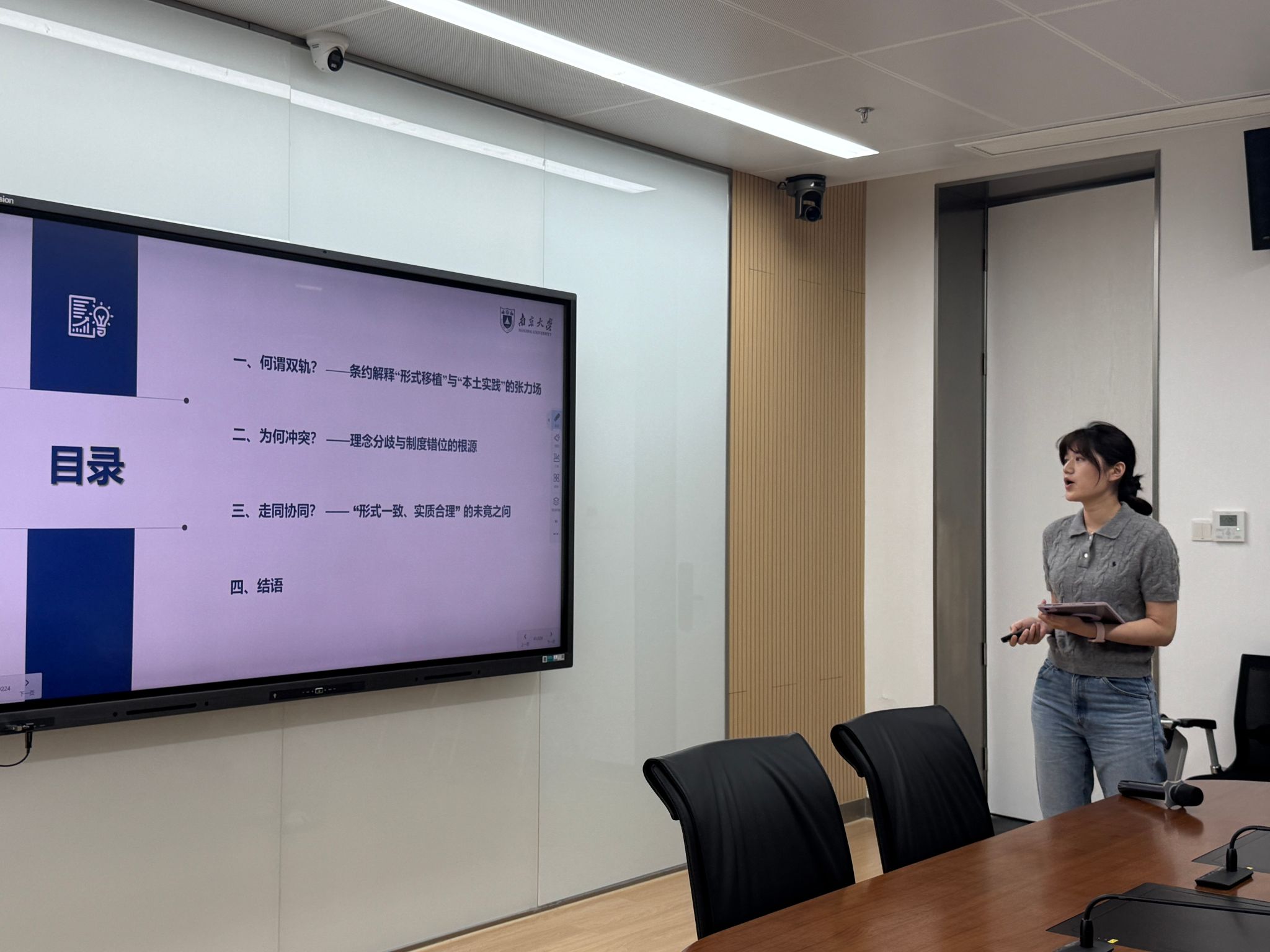 陈伊同学做题为“体系解释方法在我国条约解释制度中的适用”的汇报,围绕体系解释在我国条约解释制度中的适用展开,先介绍我国条约解释规则及《维也纳条约法公约》第31条内容,再阐述体系解释的定义及以融贯性为核心的三层次表现,接着分析国际法碎片化及条约体系解释的作用,最后说明条约体系解释方法在我国的适用路径与范围。
