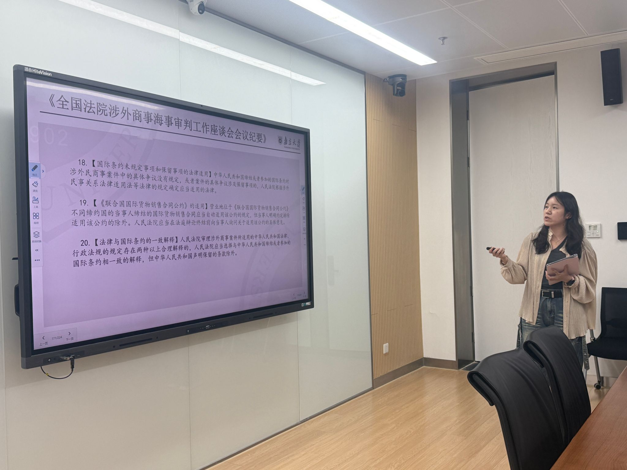 王丽文同学做题为“我国法院条约解释的实践偏误与规范回应——以CISG判例为中心的观察”的汇报,围绕我国法院条约解释实践,以CISG判例为中心,指出《民法通则》第142条废止后的制度真空及《条约解释》出台的意义,分析法院在解释条约时存在的三类偏误,探讨规范回应局限,最后从三方面提出规则构建方向。