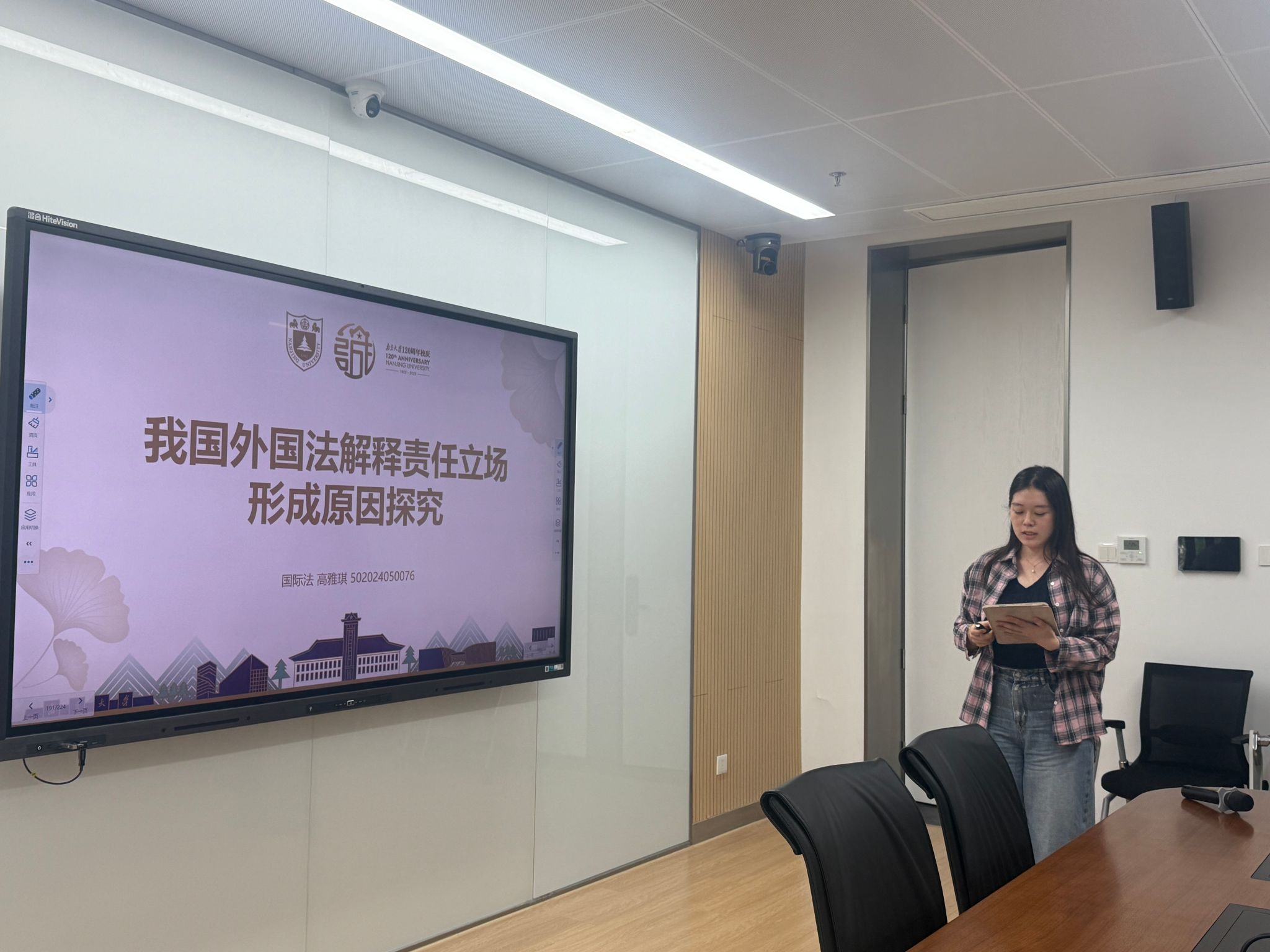 高雅琪同学做题为“我国外国法解释责任立场形成原因探究——基于外国法‘法律说’与‘事实说’争议”的汇报,先对比“事实说”与“法律说”在外国法性质等方面的差异,再梳理我国外国法解释责任立场从1986年到2023年的演进,最后从能力资源、制度设计、观念动力和外部环境等方面分析我国该立场形成的原因。