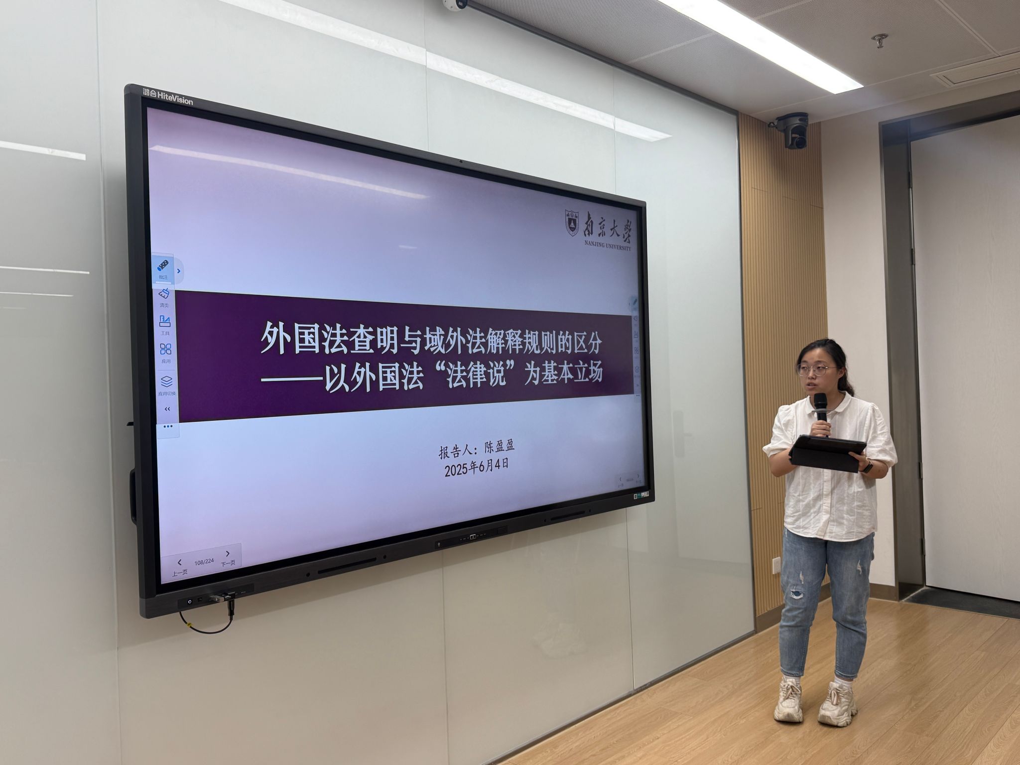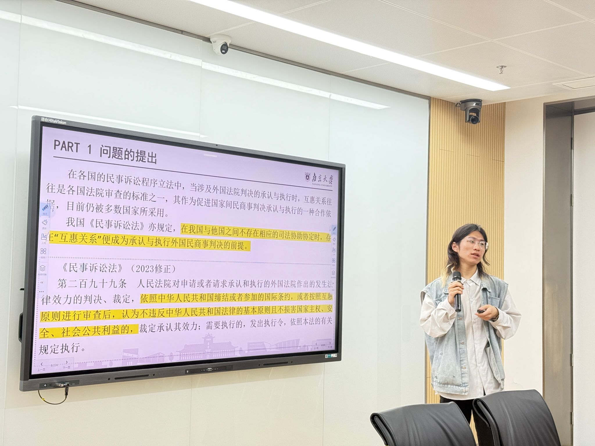 陈盈盈同学做题为“外国法查明与域外法解释规则的区分——以外国法‘法律说’为基本立场”的汇报。她以外国法“法律说”为立场,先对比“事实说” 与“法律说”的核心观点及程序影响,介绍了当前两个观点的结合趋势与我国“修正的法律说”立场;进而对我国《涉外民事关系法律适用法》司法解释(二)第8条的规定进行反思,阐明区分外国法查明与解释规则的必要性;最后从主体、效力、方法等方面提出域外法解释规则的完善方向。