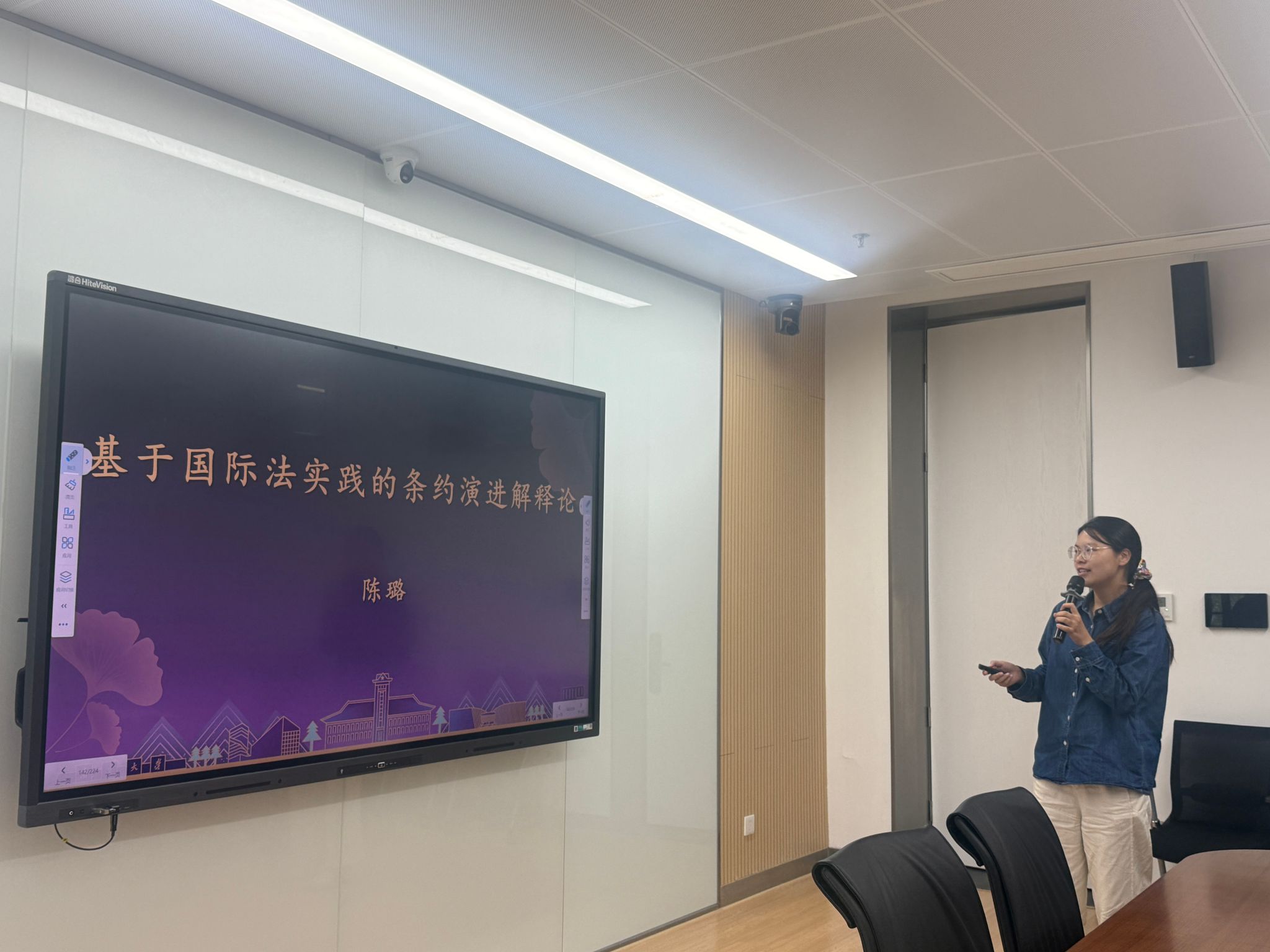 陈璐同学做题为“基于国际法实践的条约演进解释论”的汇报,围绕国际法实践中的条约演进解释展开,先介绍其背景与定义,指出时际法原则与演进解释不冲突;再从法律语言不确定性、条约法灵活性及实现长期宗旨等方面阐述必要性,以《条约法公约》和意图论为依据;接着列举国际法院和WTO相关判例;最后说明其适用限制。