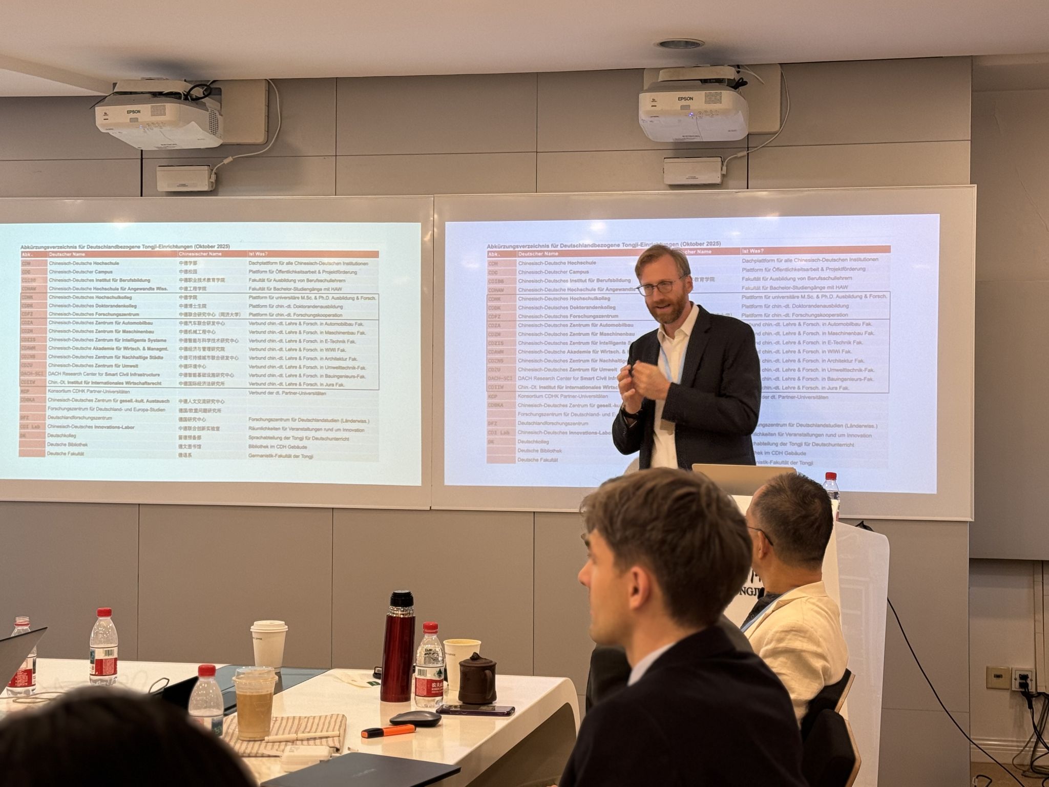 上午的研讨会气氛热烈,经过短暂的午休后,研讨会继续就三校中德法员工学习指引、职业发展规划等重要内容进行延展与讨论。同济大学中德公司副经理Jan Harder向在座师生介绍了中德公司的发展历程以及研究成果。