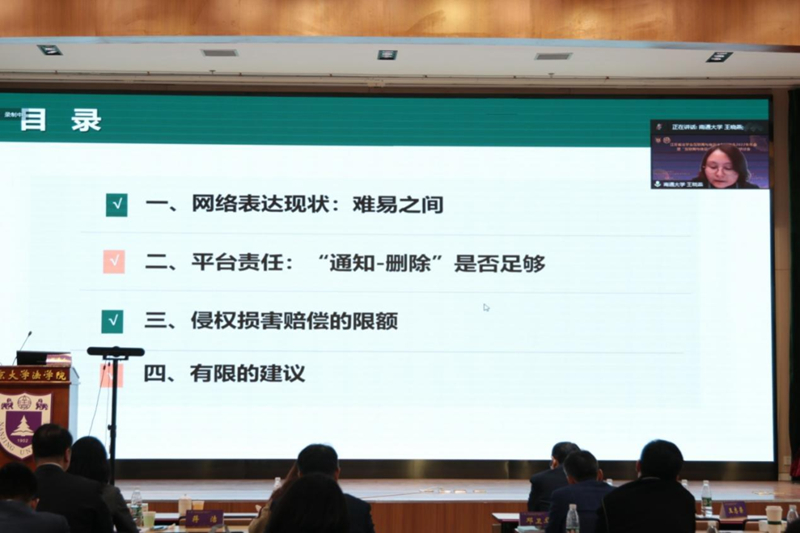 南通大学法律系王晓燕教授以《利用信息网络侵害人身权益的法律规制》为题,从平台注意义务以及损害赔偿责任两个方面分析了利用信息网络侵犯人身权利问题,提出避风港规则在现实中受到了挑战,已经无法实现利益平衡。因此,在该类侵权救济中,应当综合考虑平台服务的类型、性质、有效通知的形式准确程度,甚至是网络信息侵害权益的类型和程度等因素。
