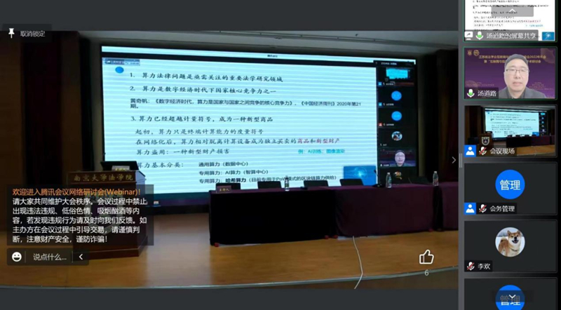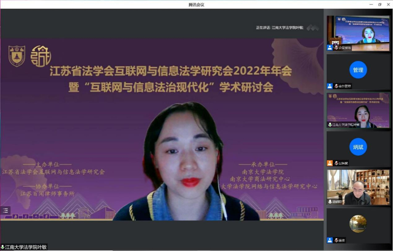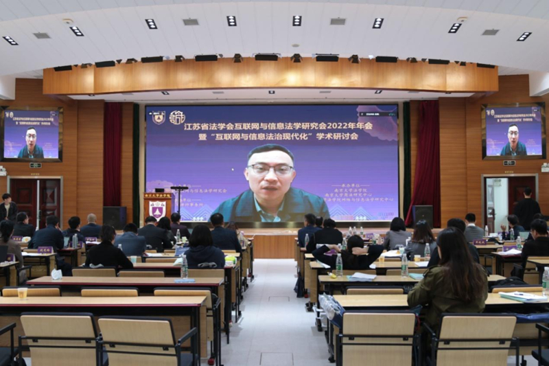 2022年11月19日,江苏省法学会互联网与信息法学研究会2022年年会暨“互联网与信息法治现代化”学术研讨会在南京成功举办。本次会议由江苏省法学会互联网与信息法学研究会主办,BB贝博艾弗森、BB贝博艾弗森商法研究中心、BB贝博艾弗森网络与信息法学研究中心承办,江苏百闻律师事务所协办,以线上线下结合的方式进行。来自中国社会科公司、BB贝博艾弗森、东南大学、华东政法大学、南京师范大学、苏州大学、南京航空航天大学、河海大学、南京理工大学、南京农业大学、中国矿业大学、江南大学、扬州大学、南京工业大学、南京信息工程大学、江苏大学、南通大学、江苏省工业和信息化厅、江苏省知识产权局、江苏省大数据管理中心、南京市中级人民法院、苏宁易购等单位的代表参加了会议。