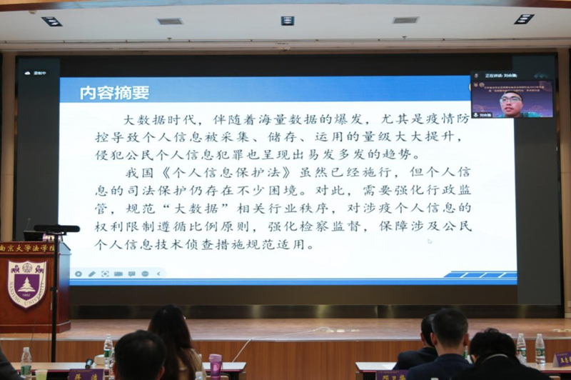 海安市人民检察院办公室刘合臻副主任在以《数据治理视阈下公民个人信息保护的隐忧与对策》为题的报告中,指出当前个人信息的司法保护运行中还存在一定的缺陷。他分析了个人信息犯罪的特点以及现实困境,并根据大数据时代的新情况和新特点,提出可以通过推动个人信息安全保护的第三方服务机构、以比例原则限制涉疫情个人信息权利和强化对司法环节的监督去改善当前的司法环境。