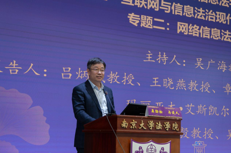 专题二“网络信息法治问题”的研讨由江苏省法学会互联网与信息法学研究会副会长、南京理工大学知识产权公司吴广海教授和江苏省法学会互联网与信息法学研究会副会长、苏宁控股集团有限公司法务总监邢嘉栋共同主持。