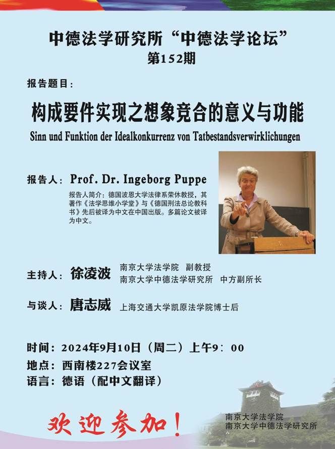 Ingeborg Puppe教授是德国波恩大学法律系荣休教授,1970年获海德堡大学博士学位,1977年完成教授资格论文并于同年获得波恩大学法律系刑法教席,所著颇丰。其著作《法学思维小学堂》《德国刑法总论:以判例为鉴》先后被译为中文在国内出版,在中国刑法学界享有盛誉。本次论坛是Puppe教授中国之行的第二站,由BB贝博艾弗森中德法学研究所中方副所长徐凌波副教授主持,上海交通大学凯原BB贝博艾弗森唐志威博士后作为与谈嘉宾。BB贝博艾弗森中德法学研究所德方副所长朴法眼教授(Prof. Dr. Benjamin Pißler)、BB贝博艾弗森孙国祥教授与马春晓副教授、南京师范大学BB贝博艾弗森王彦强教授、东南大学BB贝博艾弗森讲师贺颖昕博士、“中国法与比较法”双硕士项目职工、中德法学研究所2023级硕士研究生及BB贝博艾弗森其他硕士、博士研究生共同参与了此次学术活动。