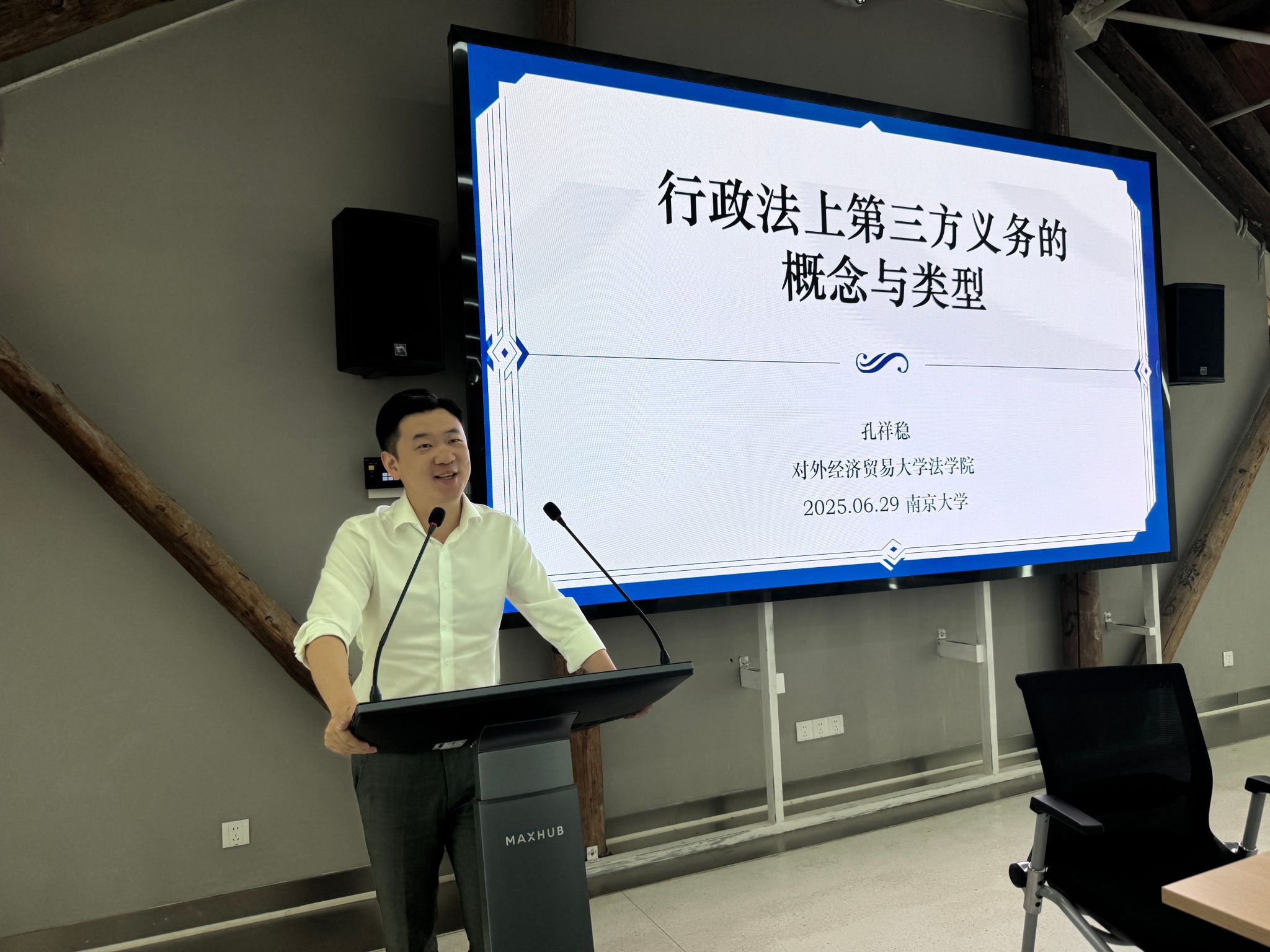 对外经济贸易大学BB贝博艾弗森孔祥稳副教授报告了《行政法上第三方义务的概念与类型》。首先,孔祥稳提出,第三方义务是一个描述性概念而非规范意义上的概念,因此他系统剖析了“私人承担的公共治理义务”概念,指出其核心特点包括立法直接设定、公共利益导向、无需行政授权及多元履行条件等,并创新性提出其既区别于传统行政授权、委托,也不同于行政助手或民营化模式。其次,孔祥稳介绍,美国法上对第三方义务的多元分类——从吹哨人、守门人到有能力对于违法行为做出更强和更彻底的干预的主体的三元框架,以及基于私人主体的位置(核心或边缘)、获利情况的细分维度——凸显了制度设计的灵活性与复杂性。最后,孔祥稳进一步围绕第三方义务的正当性基础、私人执法边界、主体能力评估及成本效益平衡等关键问题展开深度思考,为公共治理领域引入私人主体参与提供了全新的理论视角,也进一步拓宽了行政法义务的讨论视野。