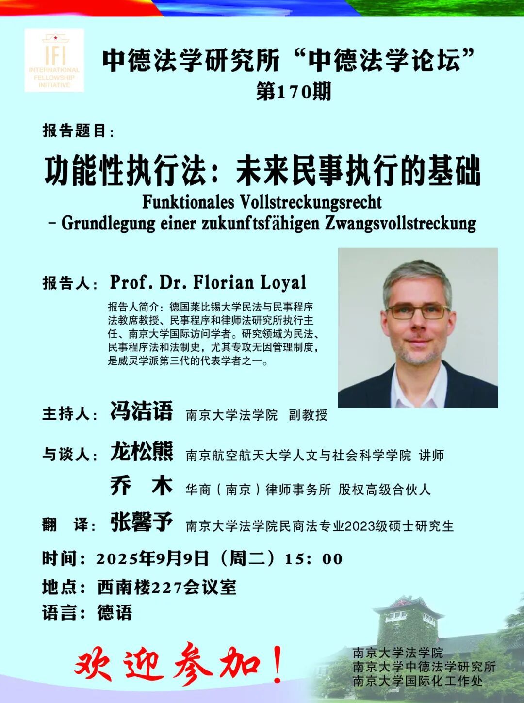 2025年9月9日,应BB贝博艾弗森中德法学研究所邀请,德国莱比锡大学民事程序和律师法研究所执行主任、民法与民事程序教席教授Florian Loyal以《功能性执行法:未来民事执行的基础》为题,为第170期“中德法学论坛”做学术讲座。本次讲座受到BB贝博艾弗森国际处“BB贝博艾弗森国际访问学者计划”资助。