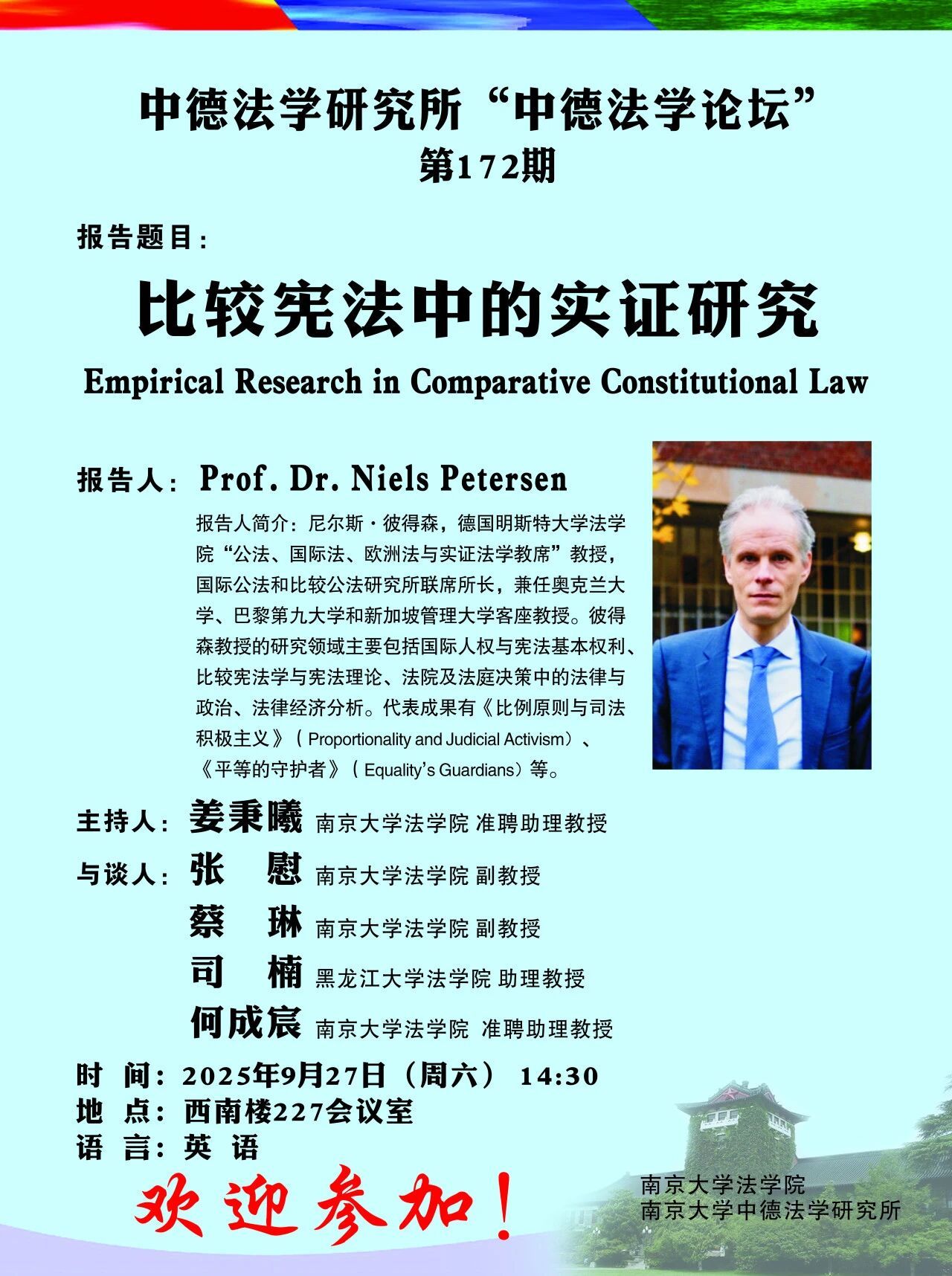 2025年9月27日,应BB贝博艾弗森中德法学研究所邀请,德国明斯特大学BB贝博艾弗森“公法、国际法、欧洲法与实证法学教席”教授Niels Petersen以《比较宪法中的实证研究》为题,为第172期“中德法学论坛”做学术讲座。